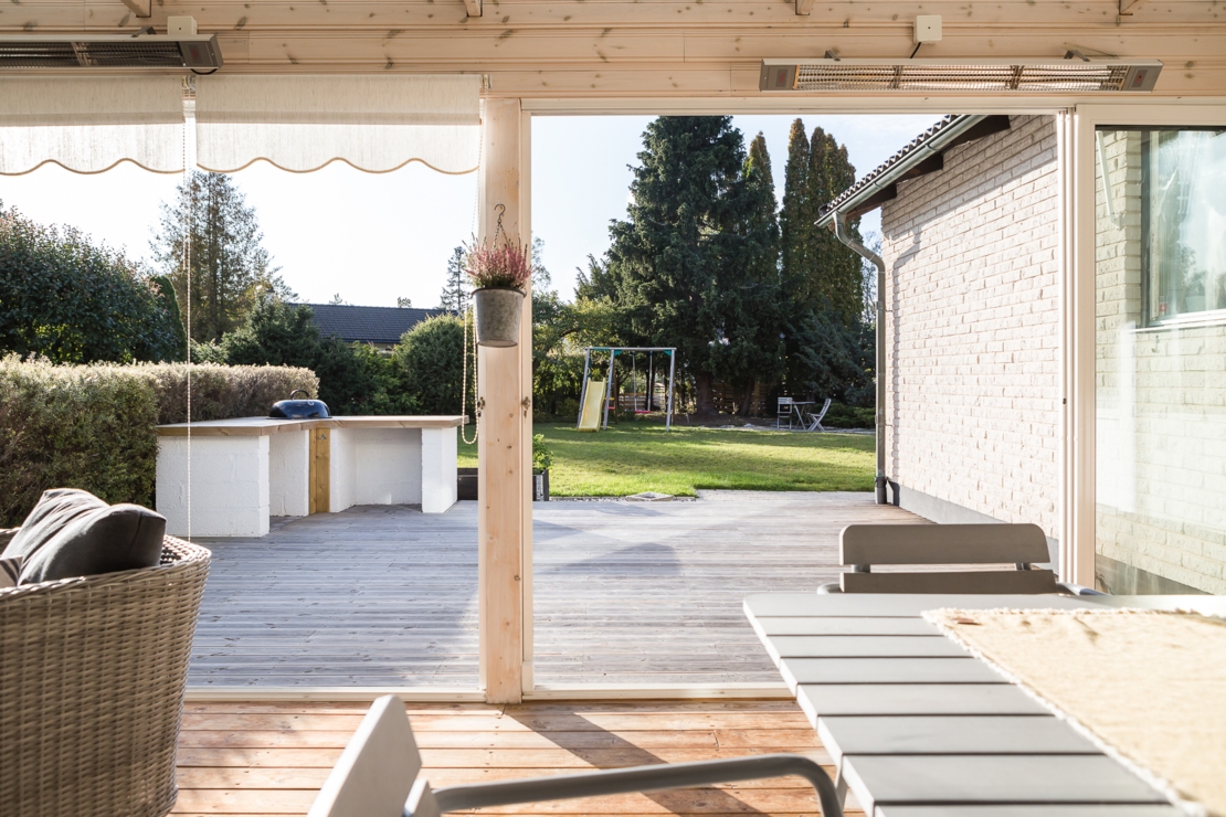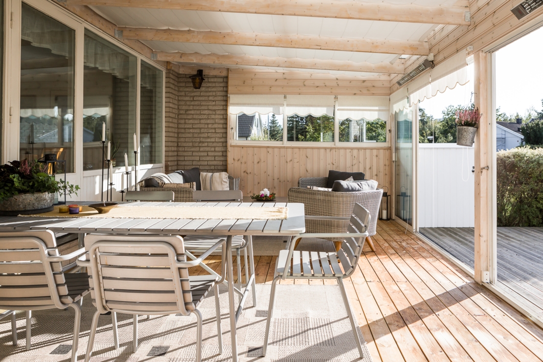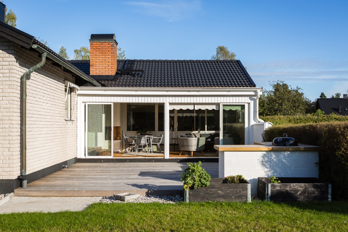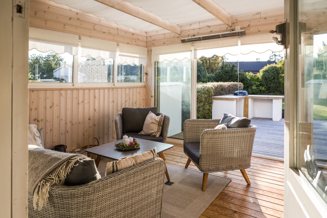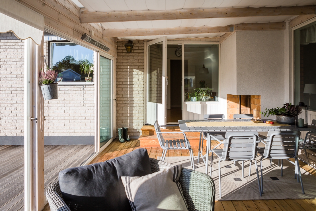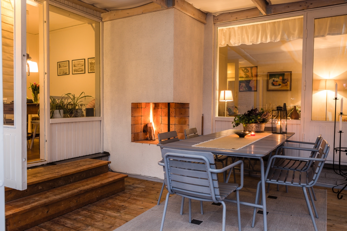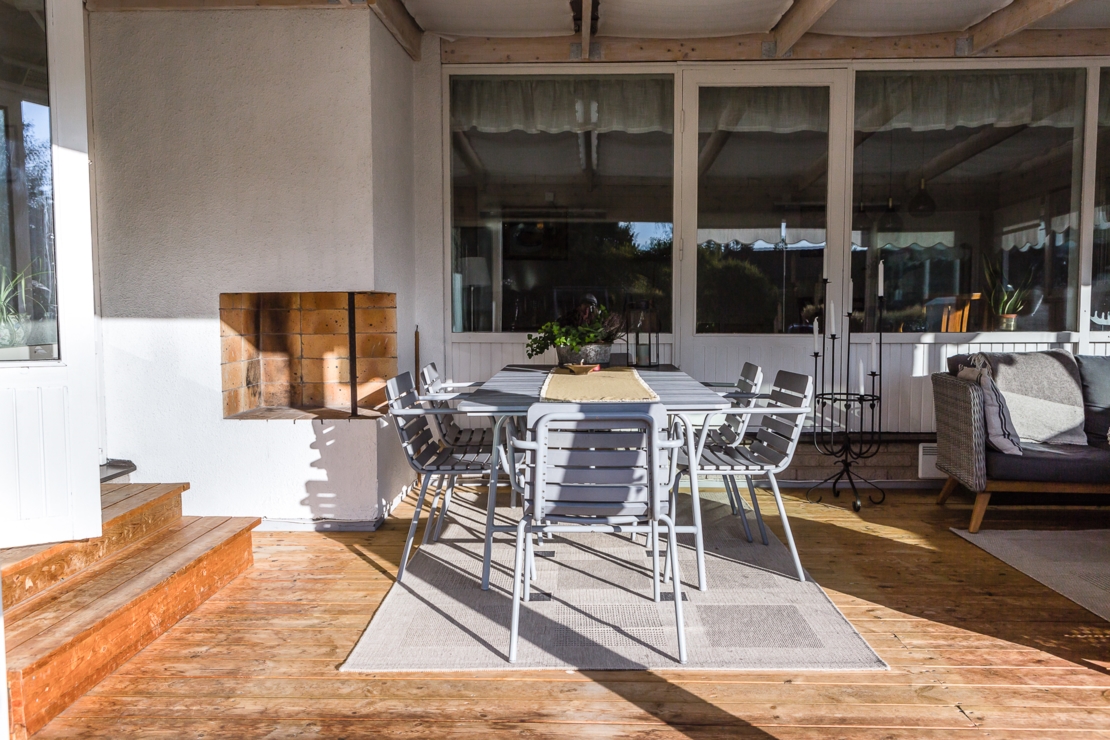 Till huset hör dessutom en mysig altan med plats för grill och ett stort och inglasat uterum. I uterummet finns öppen spis precis som i vardagsrummet för mysiga höst, vår och vinterkvällar.