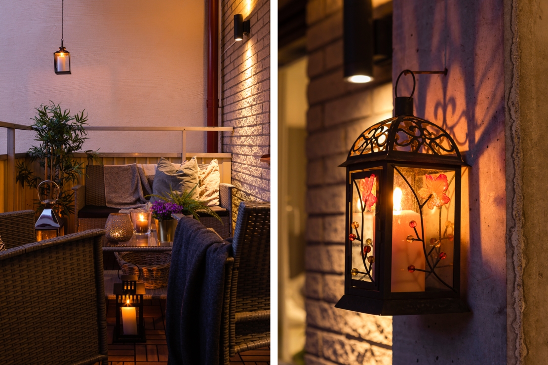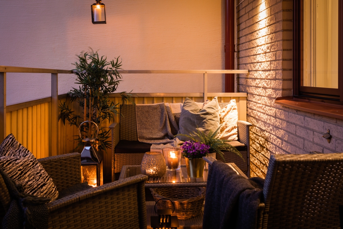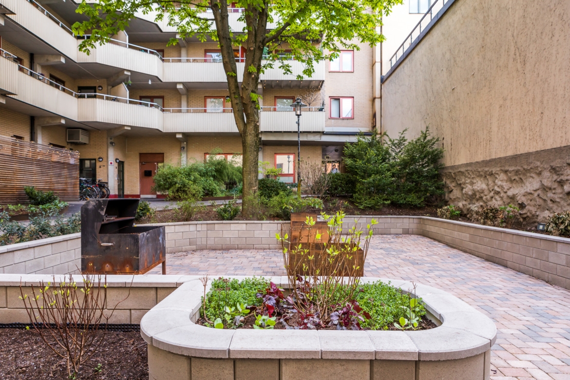 - Stor innergård med lekplats, planteringar, bänkar och ett kastanjeträd.