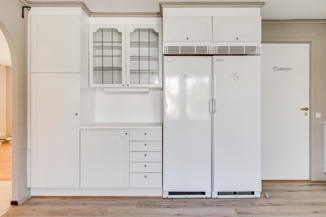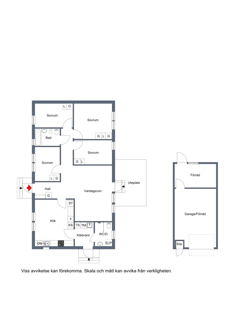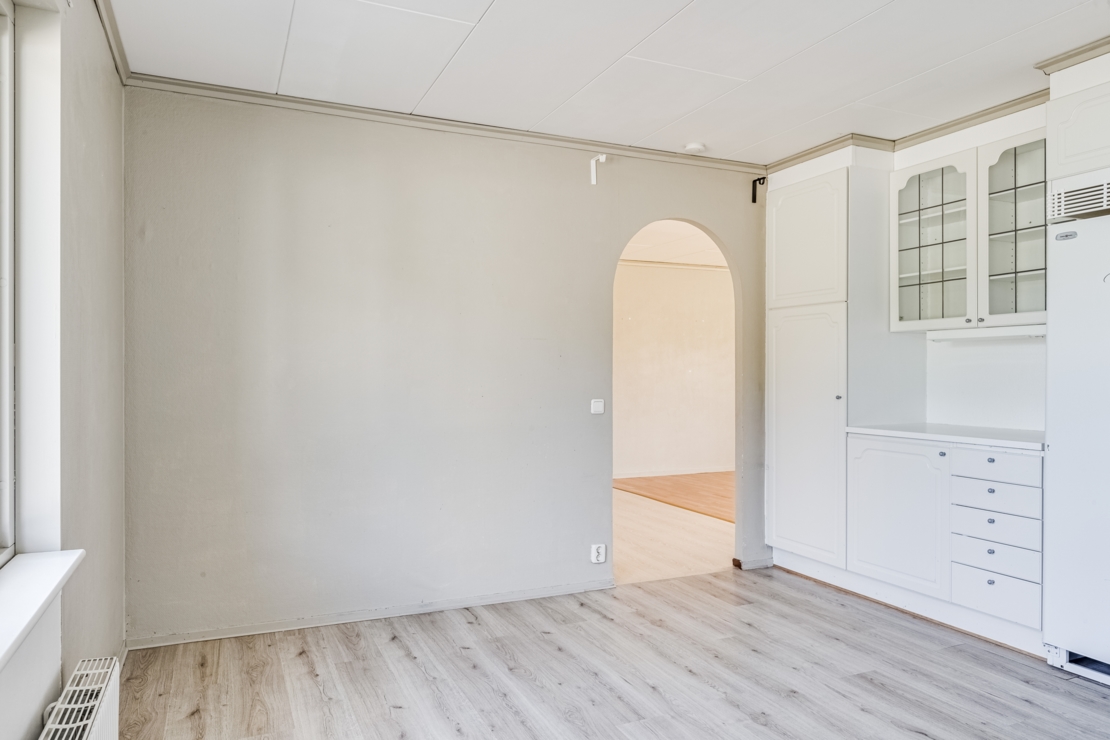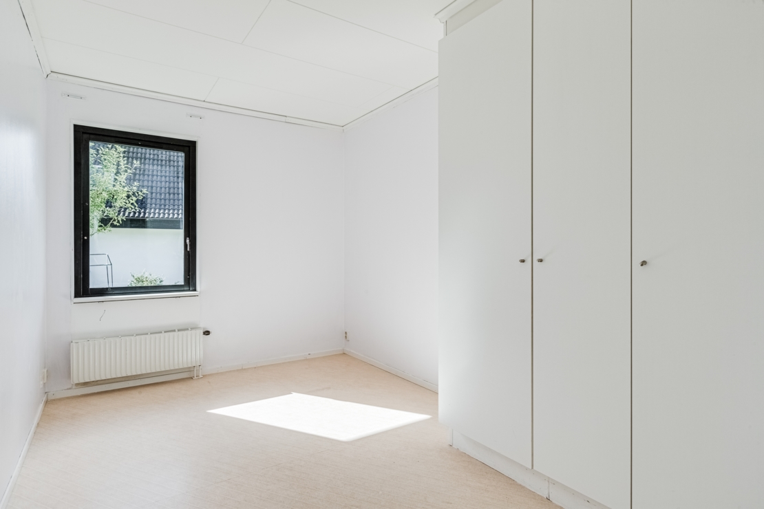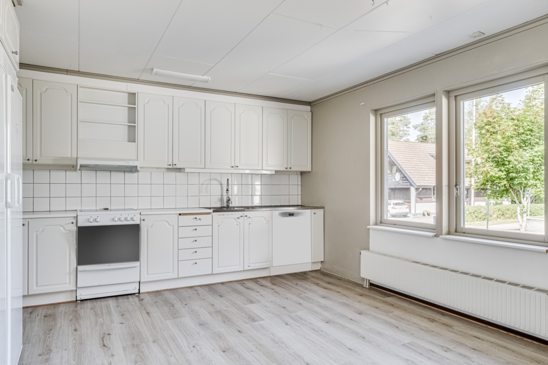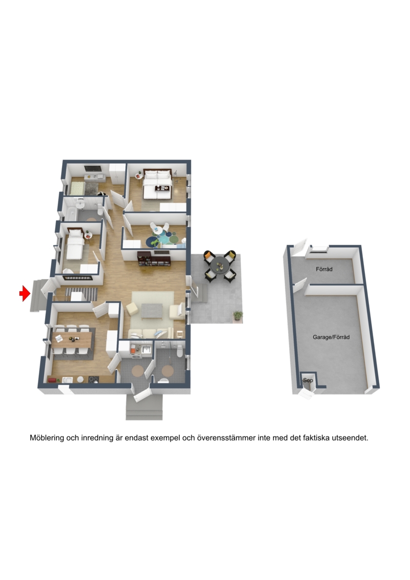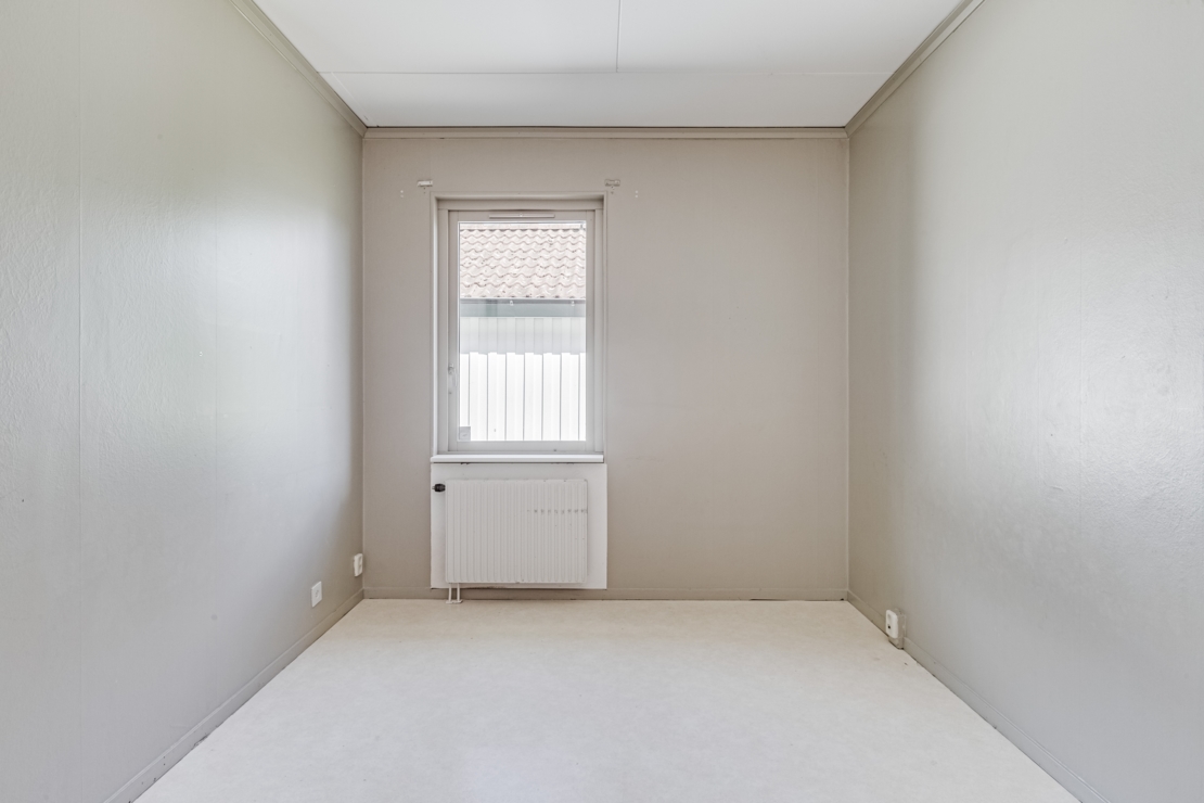 Ett välplanerat 1-planshus med avskilda delar i huset för olika behov och umgänge. I ena flygeln avskilt placerat ligger 4 sovrum samlade kring det stora badrummet med badkar och i den andra ett stort kök, tvättstuga, badrum med dusch och groventré. I mittpartiet finns vardagsrummet som präglas av en stor och öppen umgängesel i husets mitt som ger kontakt med entrésidan och trägården. Vardagsrummets fönster är stora och ger ett vackert ljusinsläpp. Garage och förråd finns på tomten. Fiber indraget.