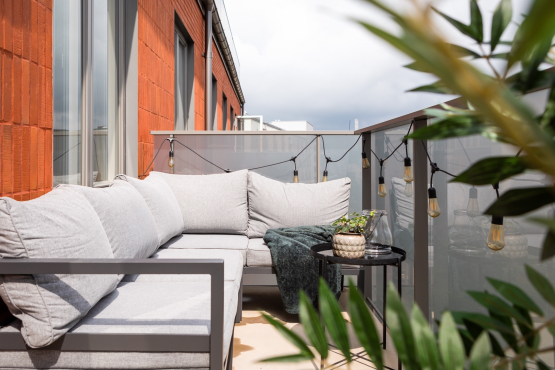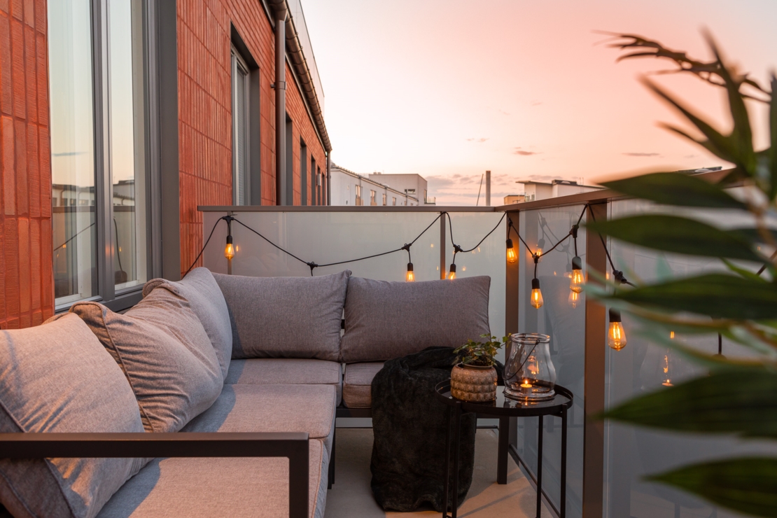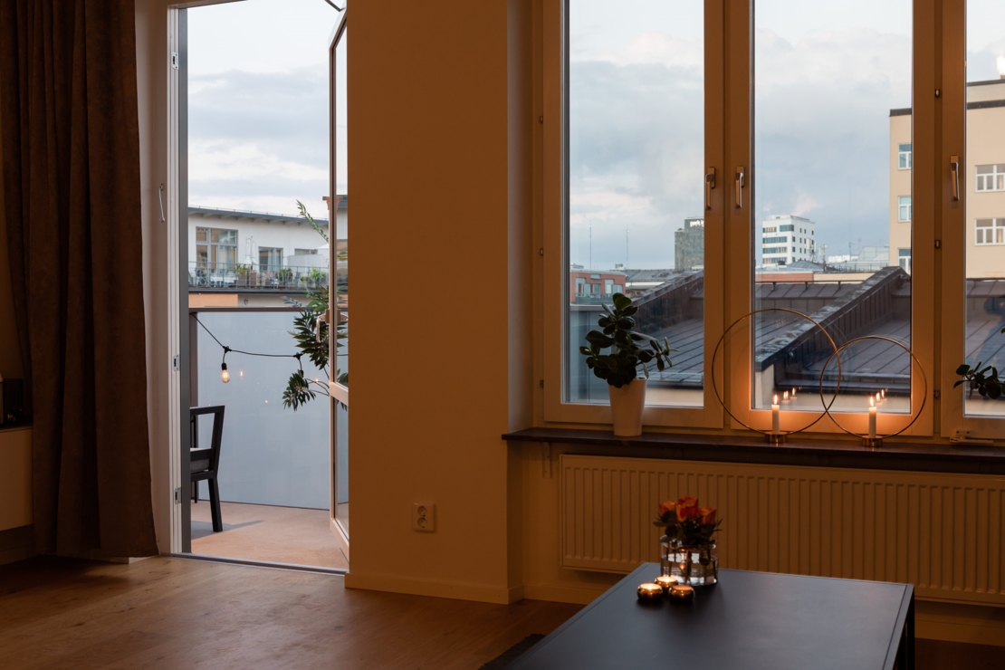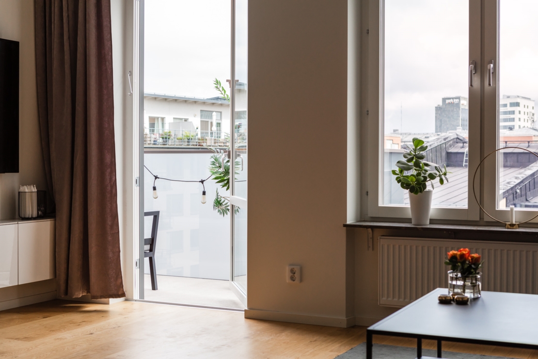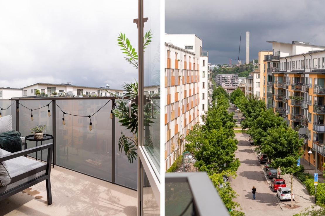 Högt upp i huset med balkong i bästa läge