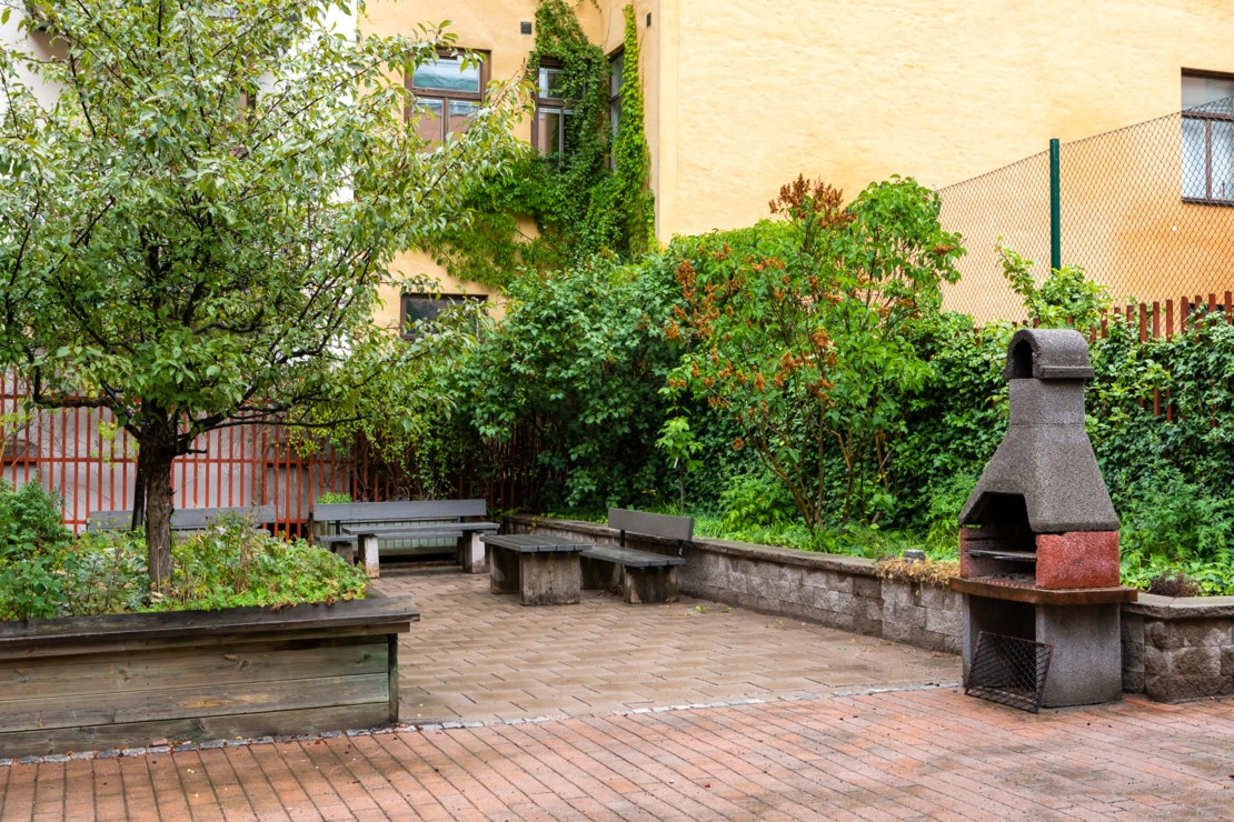 - Hobbyrum med hyvelbänk och skruvstycke finns i källaren