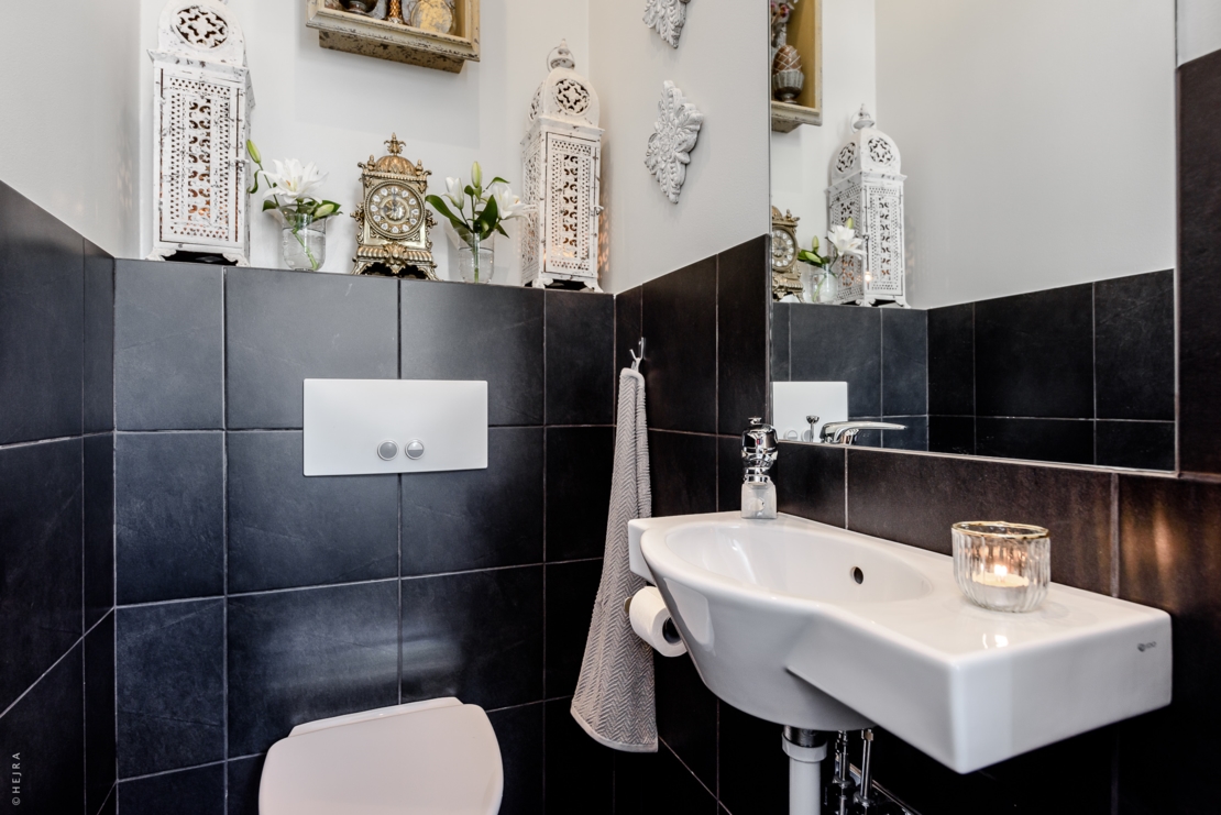 Gäst-wc med svart klinkergolv, vägghängd wc samt handfat.