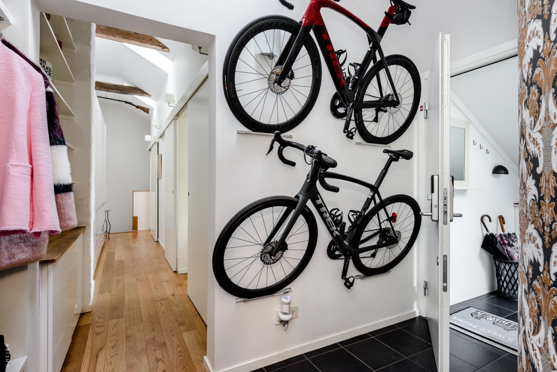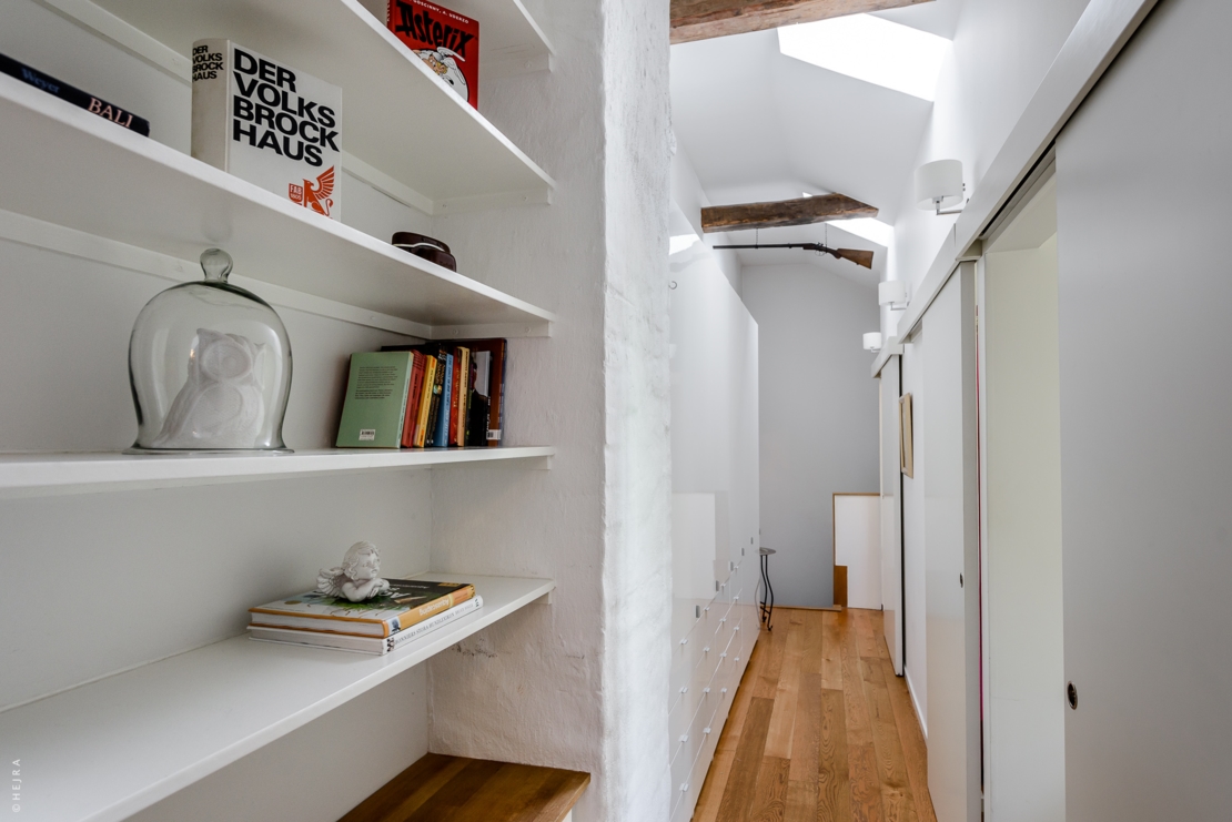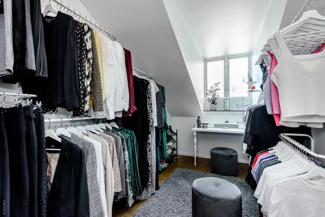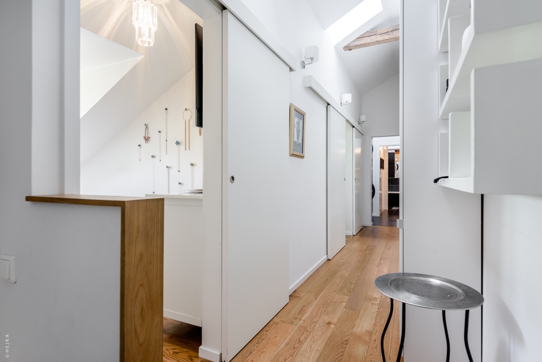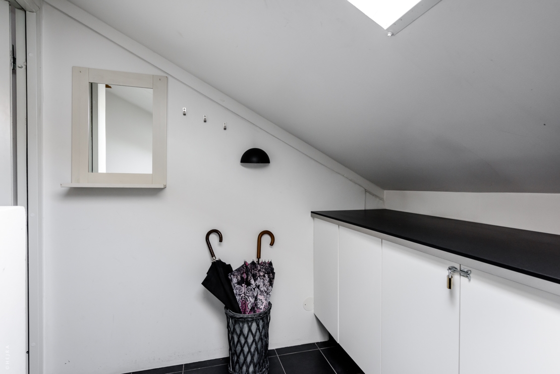 Hall plats för avhängning. I passage mot nedre plan finns platsbyggda garderober, hyllor, takfönster samt takbjälkar.