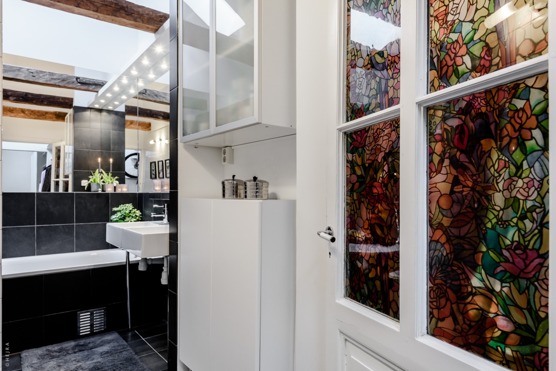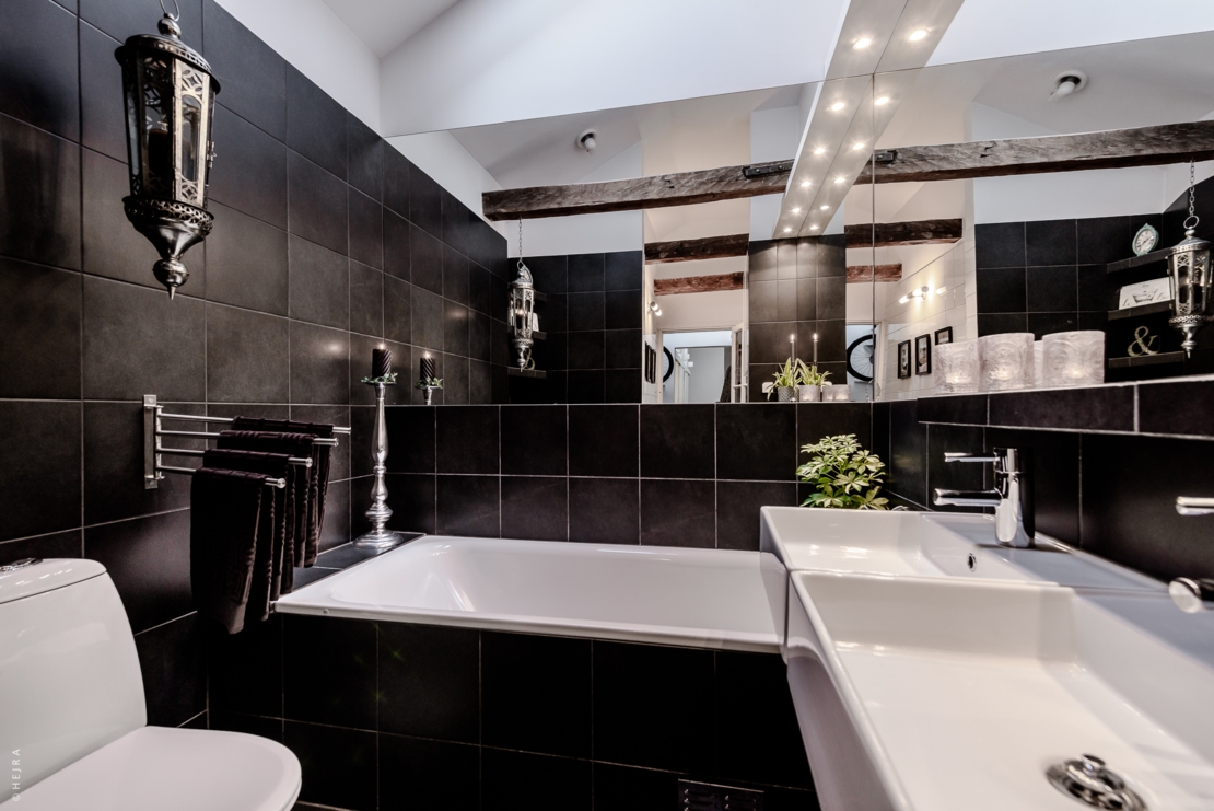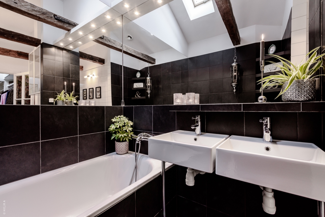 Helkaklat badrum i sober stil med svarta golvklinker och väggar. Integrerat badkar, dubbla handfat samt wc. Takbjälkar samt takfönster.