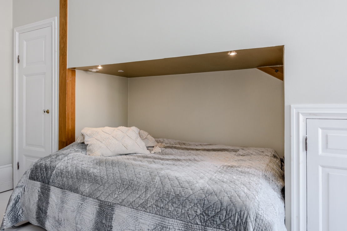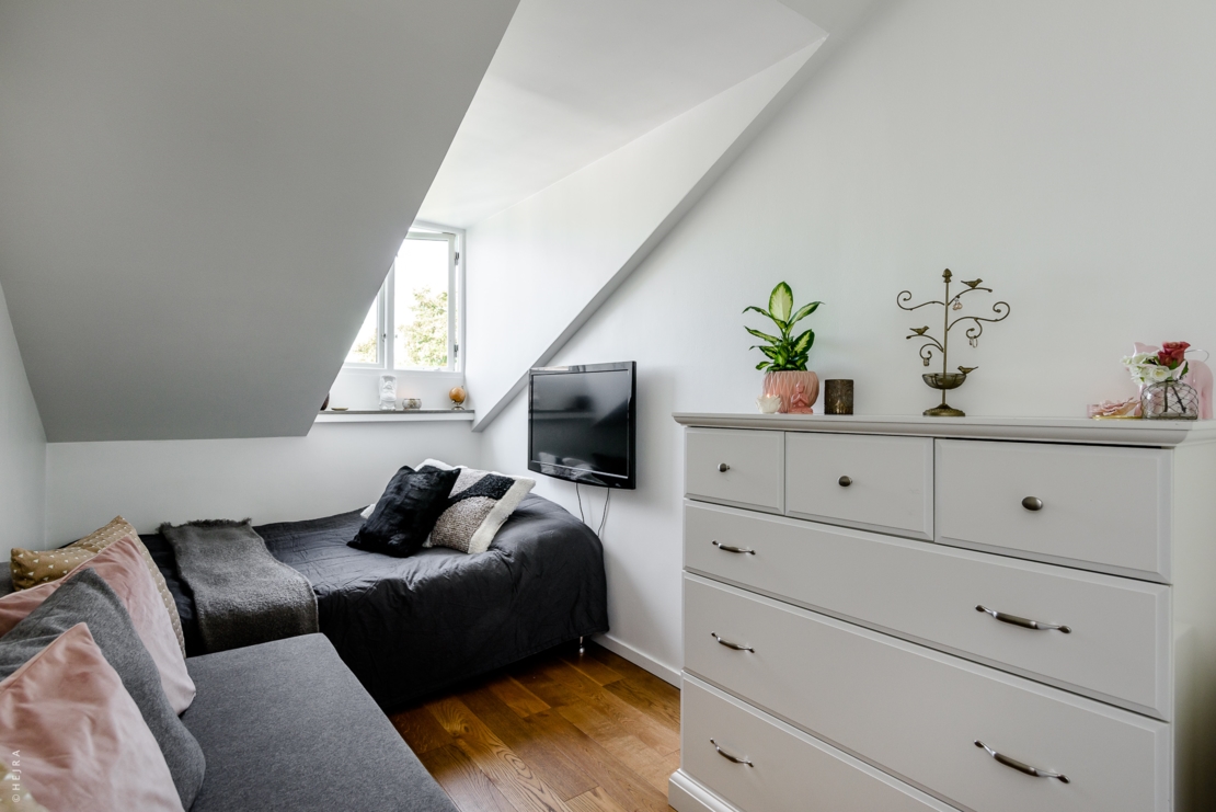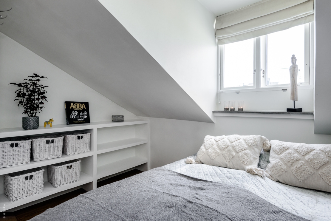 Plats för dubbelsäng, platsbyggd bokhylla samt takkupa.