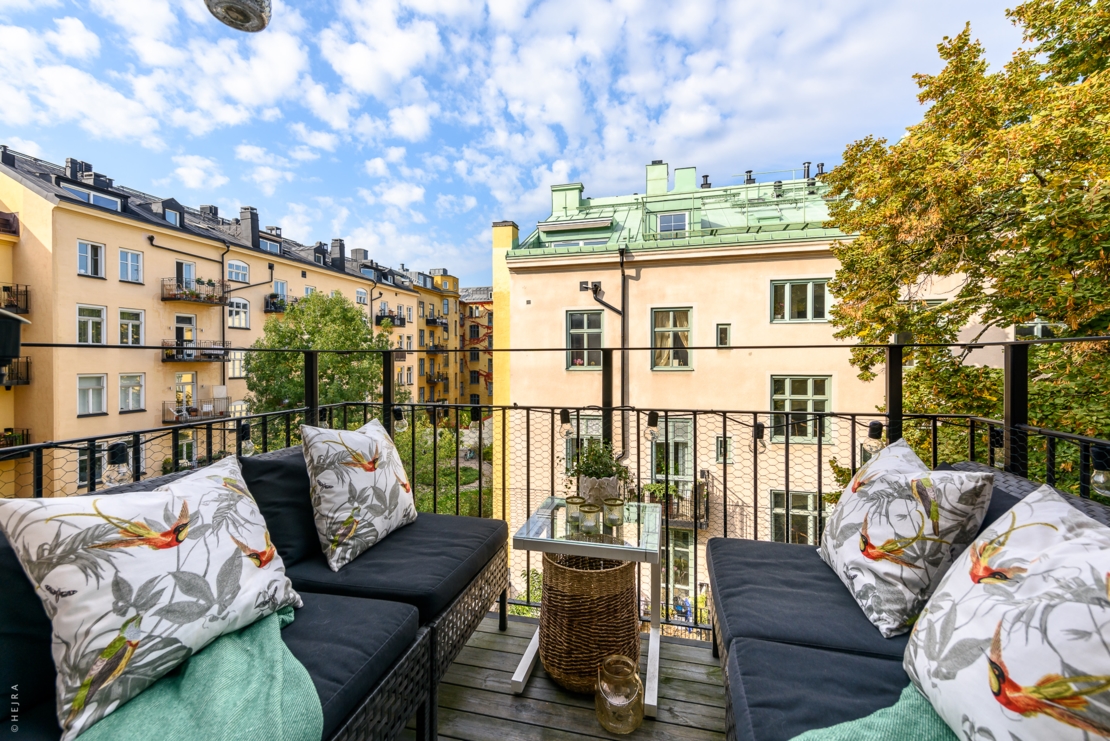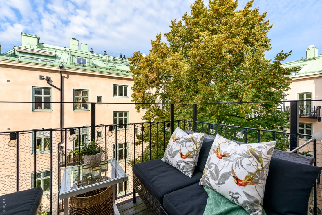 Vindsetage med balkong och fungerande kakelugn belägen mot lugn gård.