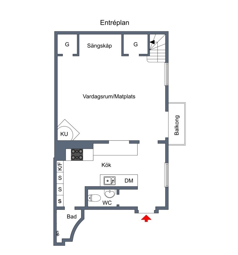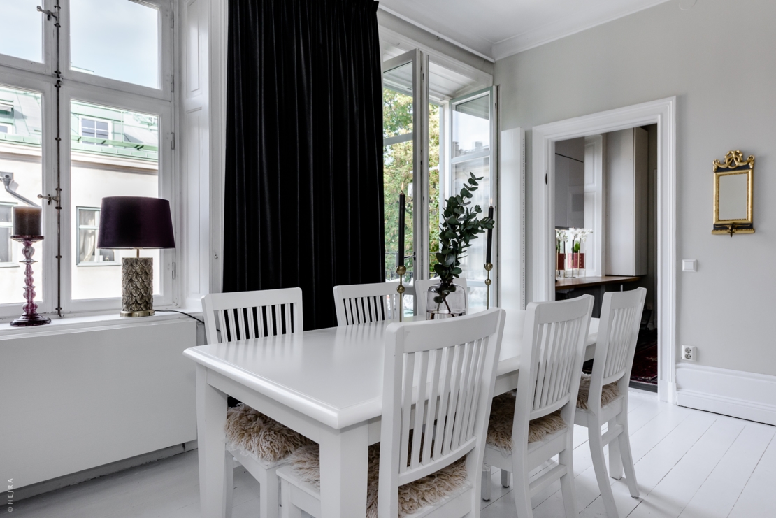 Vardagsrum med fungerande kakelugn och utgång till balkong. Matplats för 6-8 personer. Plats för stor soffgrupp och möblering. Inbyggd garderob samt sängskåp i nisch.