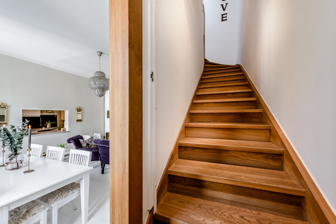Ytterst tilltalande planlösning med kök, vardagsrum, badrum, Gäst-wc och balkong på nedre plan och tre sovrum med genomgående vattenburen golvvärme, påkostat badrum och bra förvaring på övre plan.