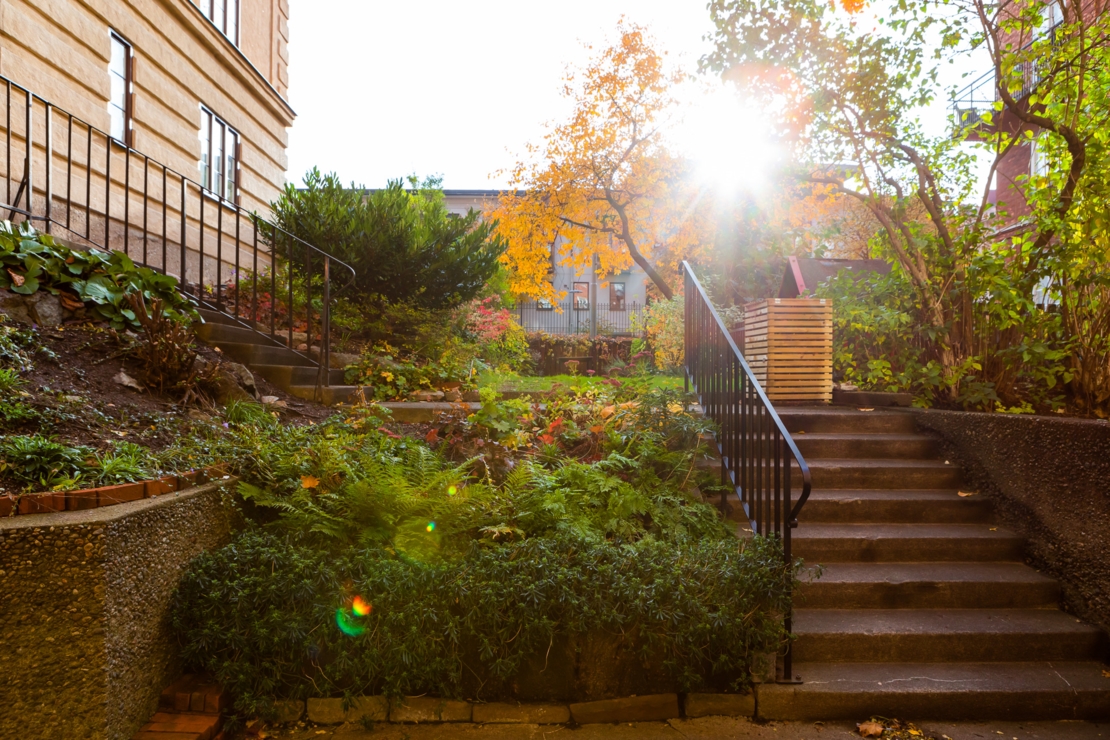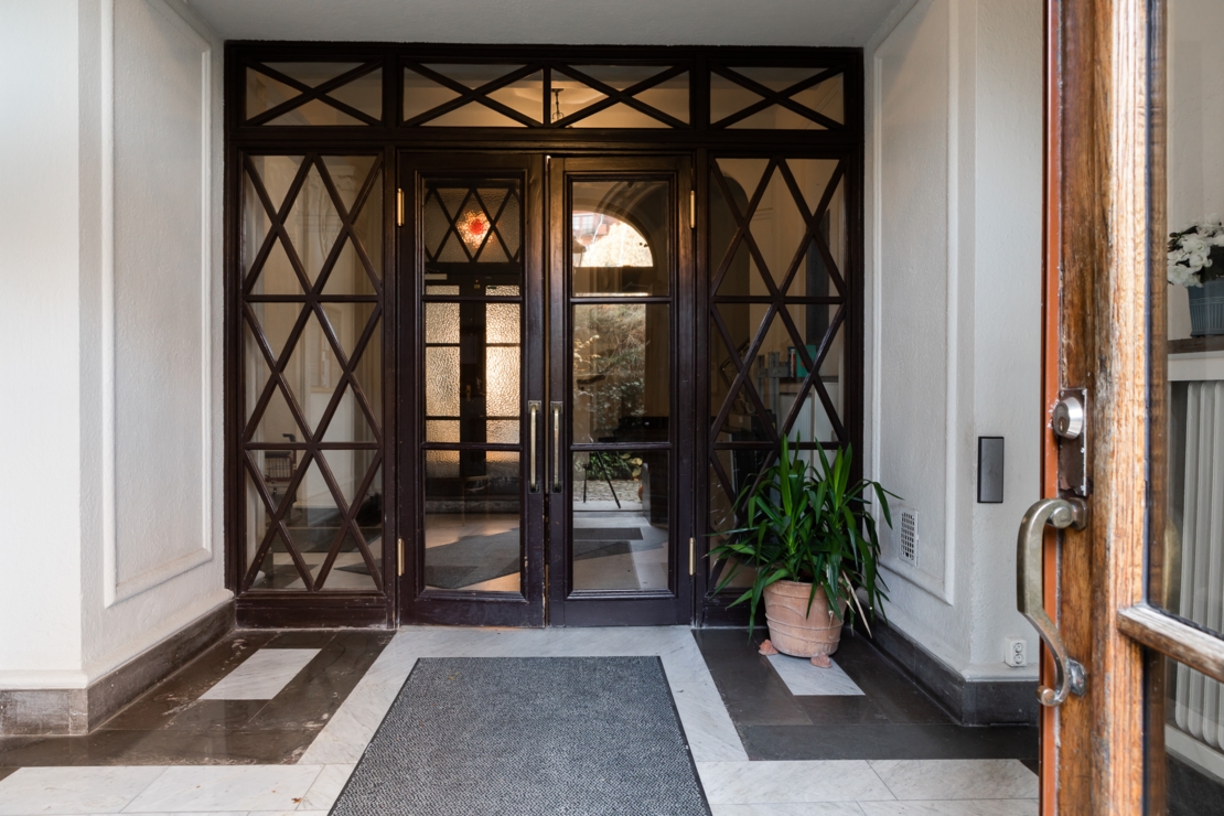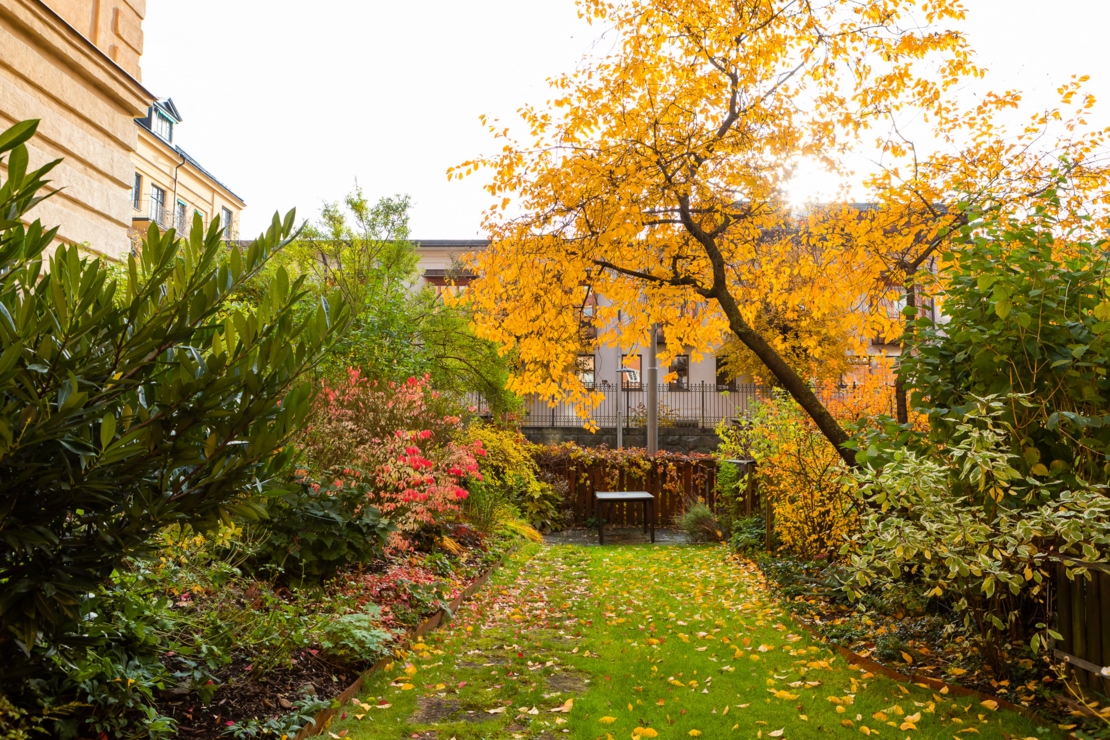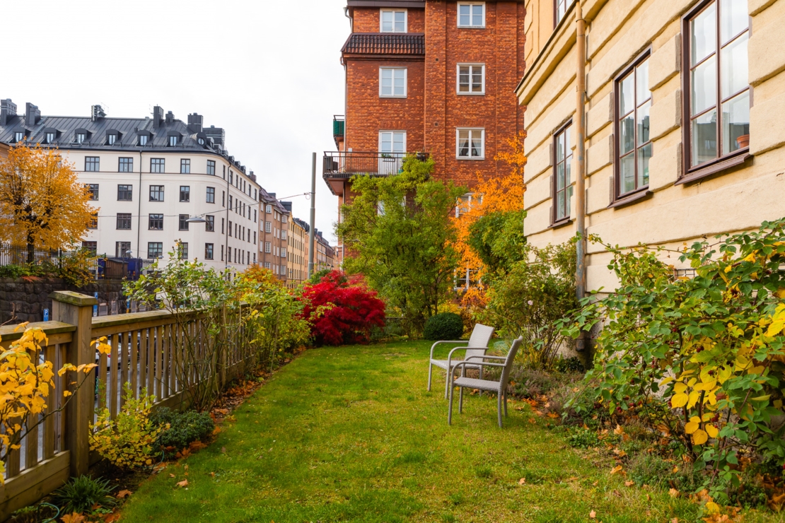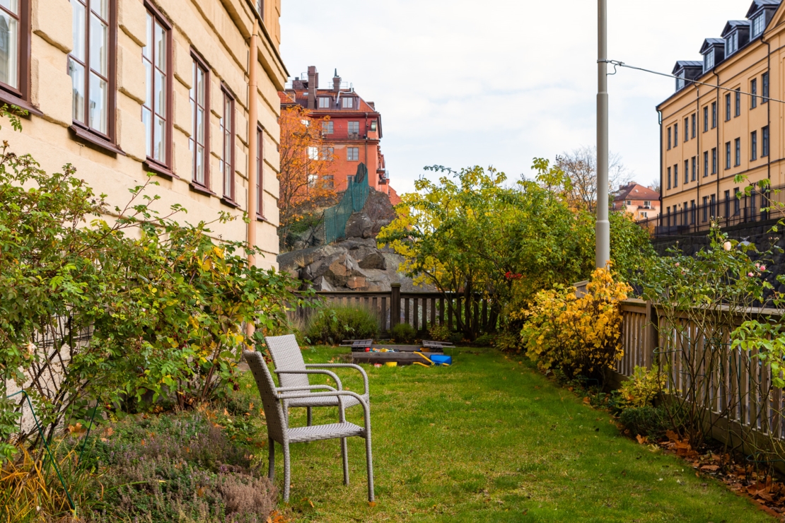 Föreningen har tvättstuga i källarplanet, en på sommarhalvåret blomstrande innergård/trädgård samt en uteplats på framsidan av huset med utsikt mot Riddarfjärden.