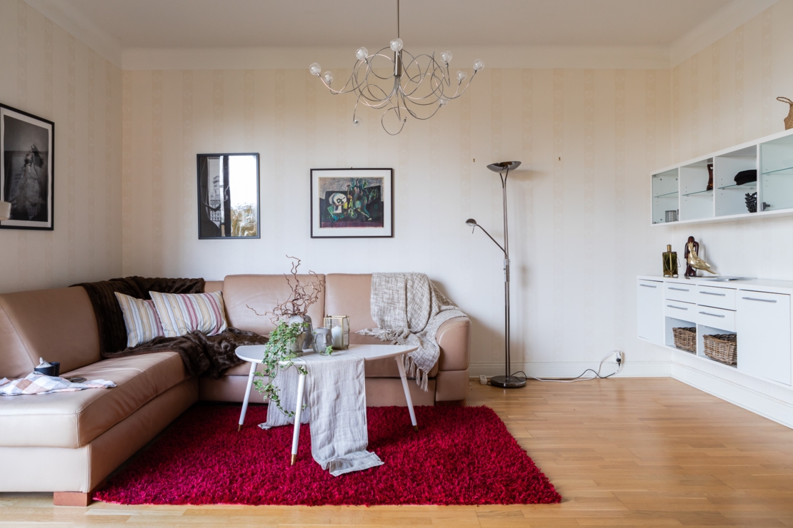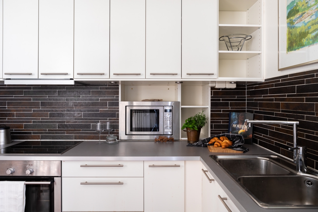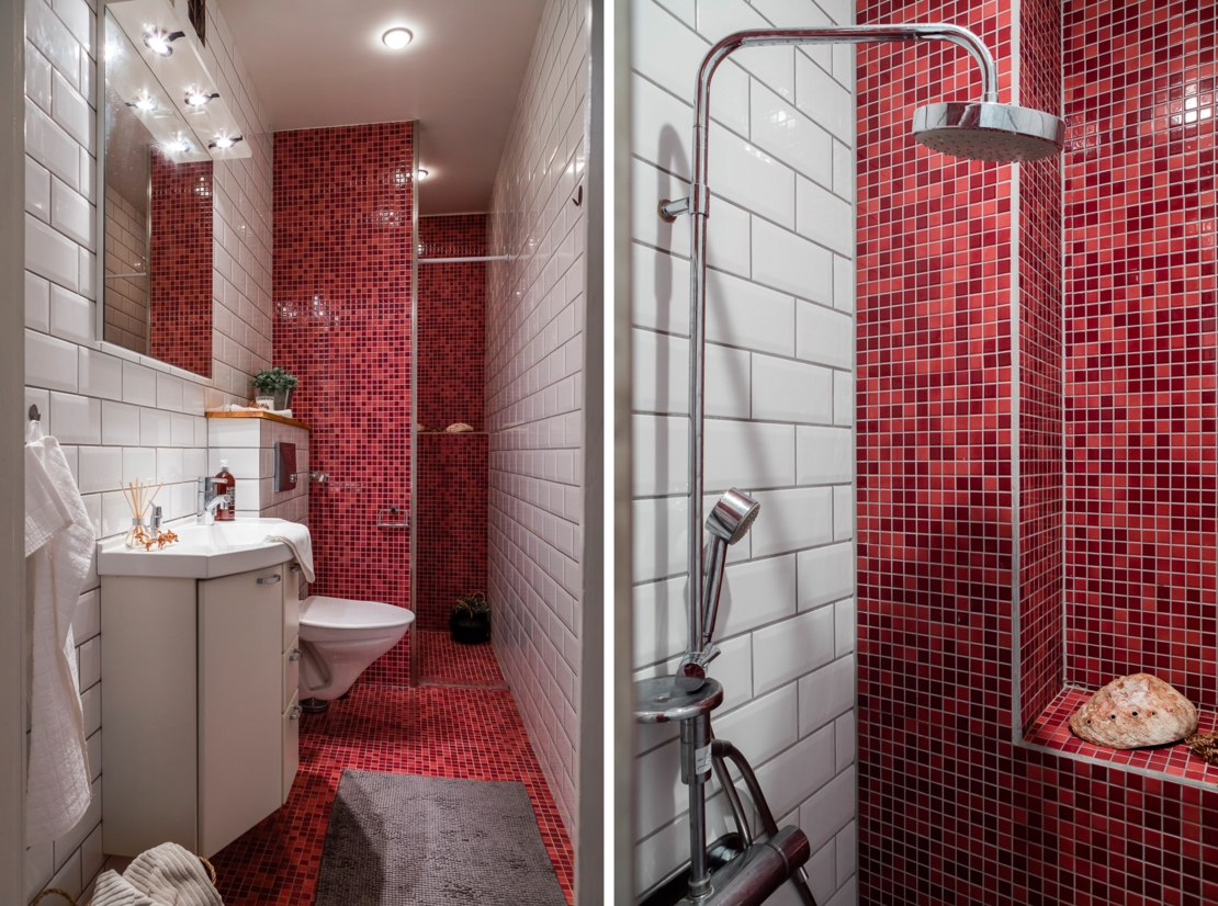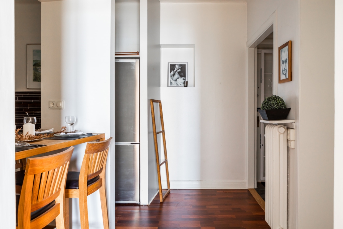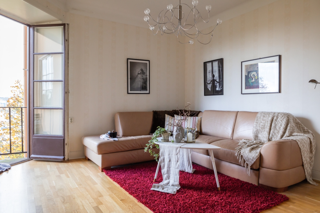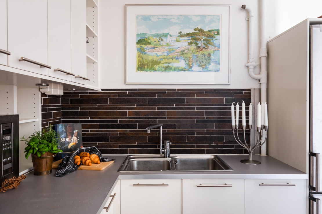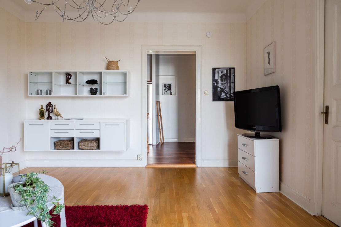 Välkomnande hall med svart högblank klinkers och garderob med plats för avhängning och förvaring. Kök utrustat med spis/spisfläkt, ugn, micro, kyl/frys samt med arkitektritad matplatsdel. Helkaklat badrum i toppskick dekorerat med snygg mosaik. Vardagsrum med charmig balkong med kvällssol och utsikt mot Långholmen och Riddarfjärden. Rymligt sovrum med plats för både dubbelsäng och extra förvaring. Lägenheten har genomgående parkettgolv.