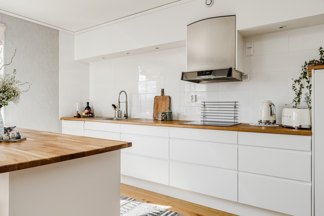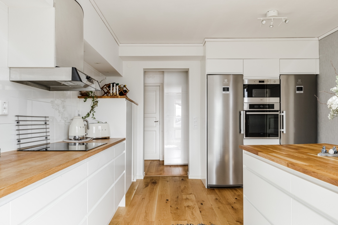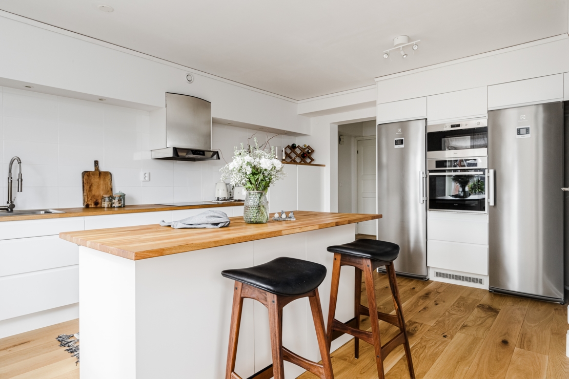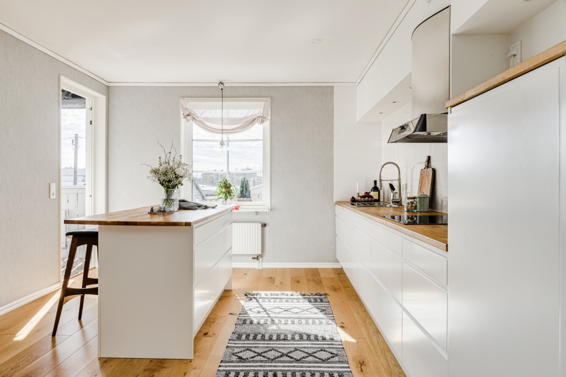 Köksinredning av fabrikat Epoq. Köksutrustningen består av: Diskmaskin från Asko, Fläkt, Induktionshäll från Bosch, Kyl från Electrolux, Frys från Electrolux, Micro från Whirlpool, Ugn från Whirlpool, Stänkskydd ovanför bänkskivan i vit kakel. Spotlights. Köksö med förvaringsmöjligheter. Anslutning till balkongen. Ett exklusivt och vackert parkettgolv i ek. Vitmålade väggar samt en fondvägg.