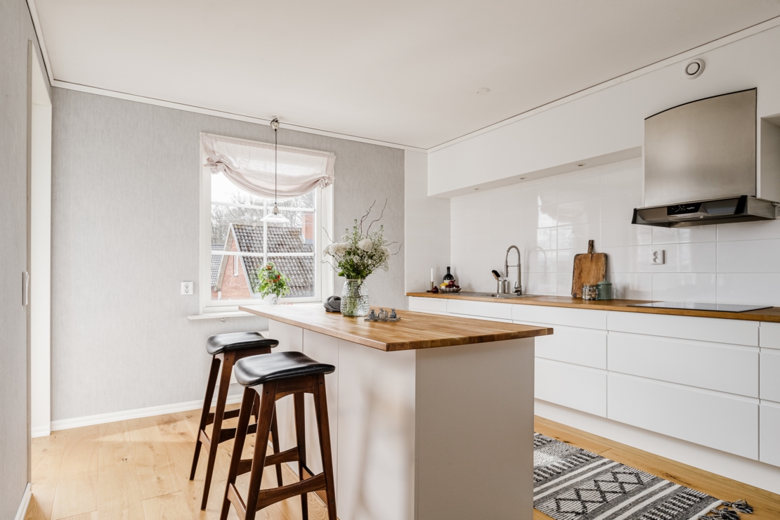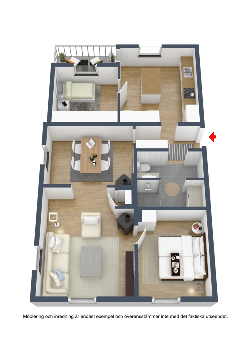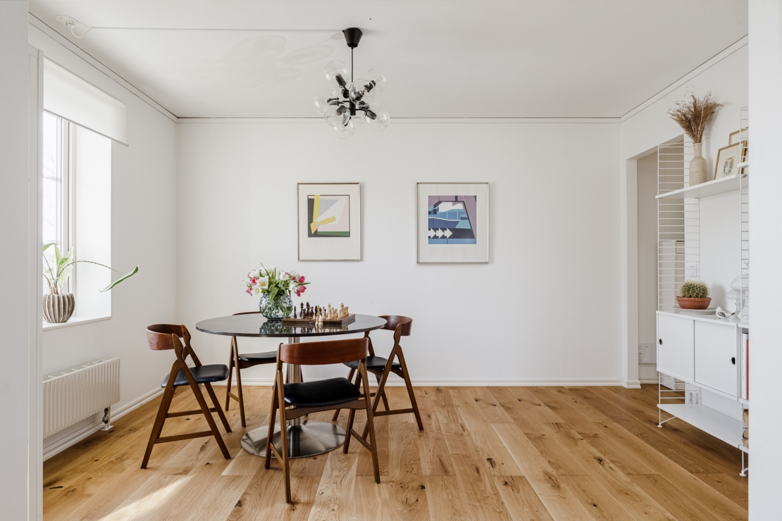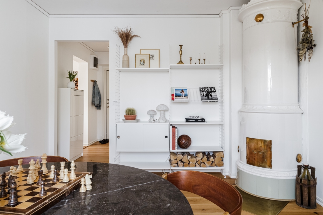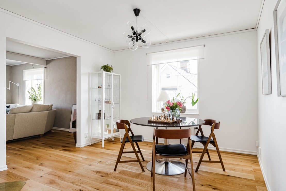 I anslutning till vardagsrummet når man den stora matplatsen med en mysig kakelugn. Den öppna planlösningen mellan matplatsen och vardagsrummet ger stora sällskapsytor. Generöst ljusinsläpp från två olika väderstreck. Ett exklusivt och vackert parkettgolv i ek.