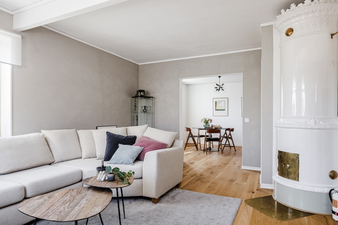 Även i vardagsrummet finns det en mysig kakelugn. Här har man ett stort allrum med gott om plats för det stora sällskapet. Stora fönsterpartier med härligt ljusinsläpp från två olika väderstreck. Ett exklusivt och vackert parkettgolv i ek.