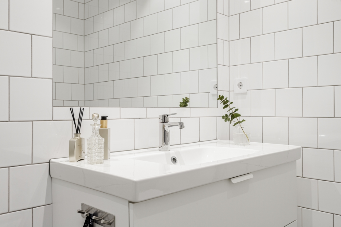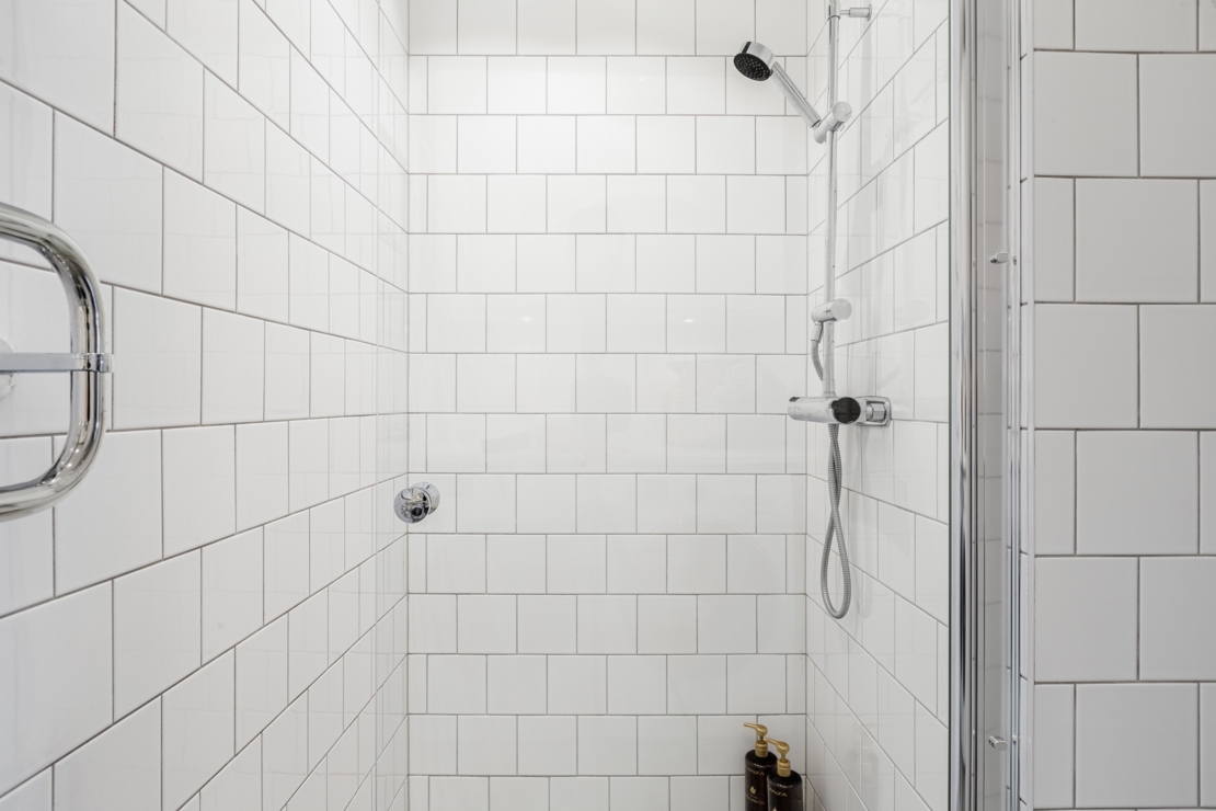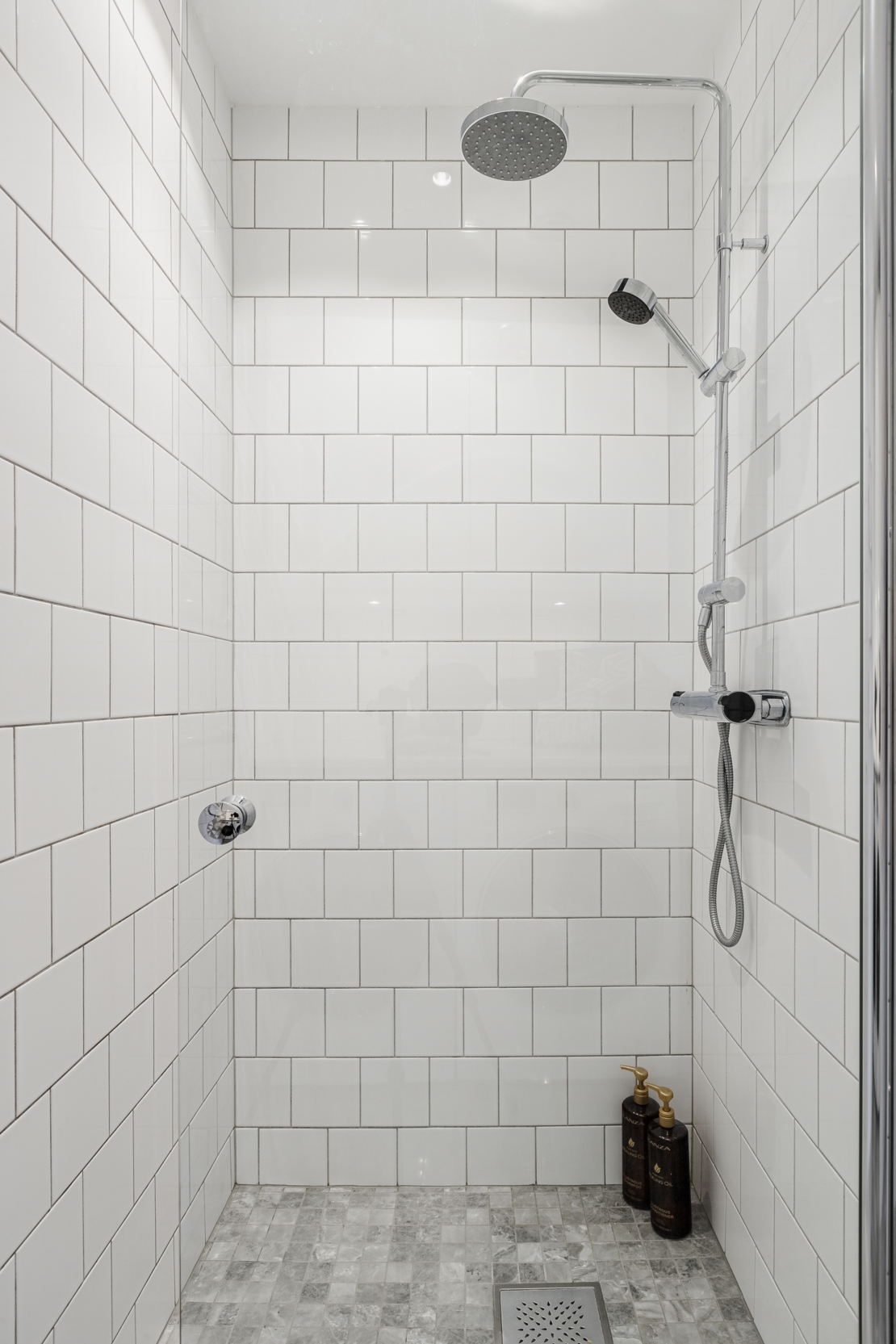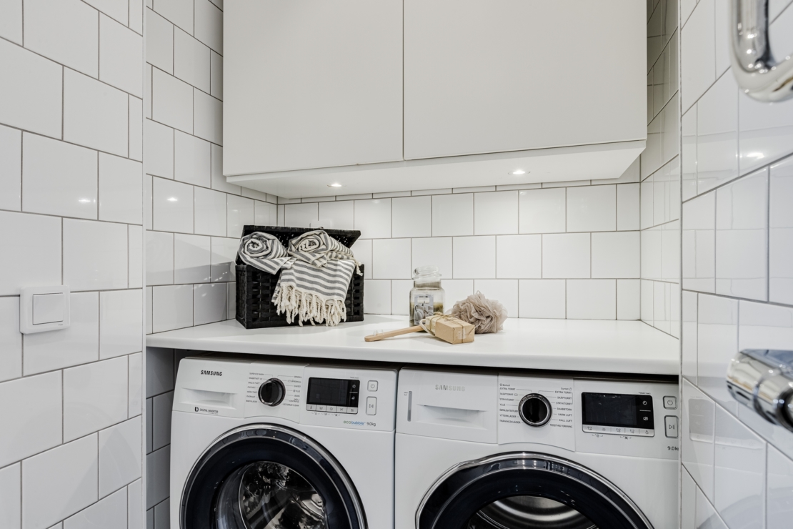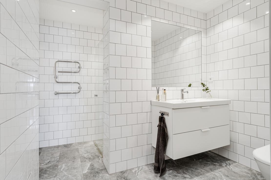 Helkaklat badrum, vit kakel på väggarna och marengo polerad klinker på golvet. Badrummet är utrustat med dusch, wc, handfat med förvaring, spegel, handdukstork, golvvärme, spotlights samt tvättmaskin och torktumlare.