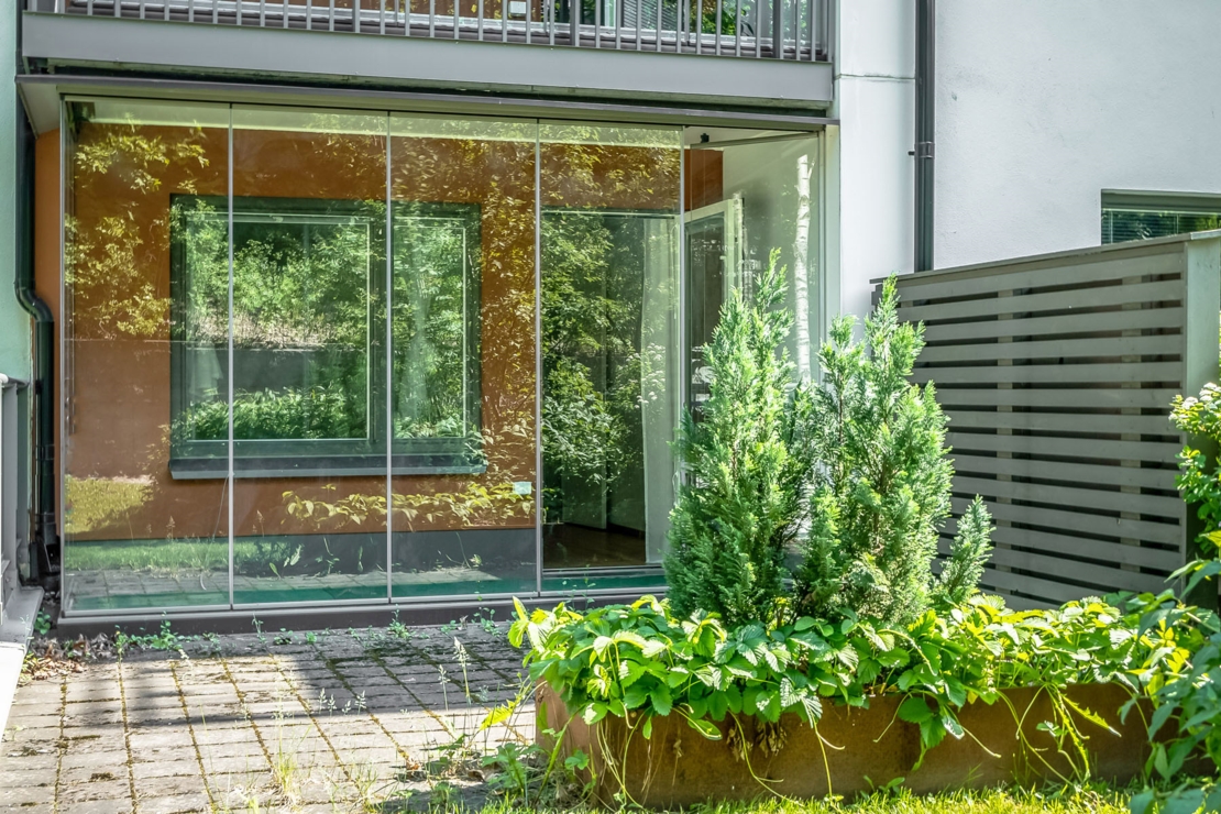 Inglasad uteplats som angränsar till en fin inhägnad trädgård. Här kan ni njuta av soliga sommardagar med grill och lek. Plats för allehanda möblemang och för barnen att leka som de vill!