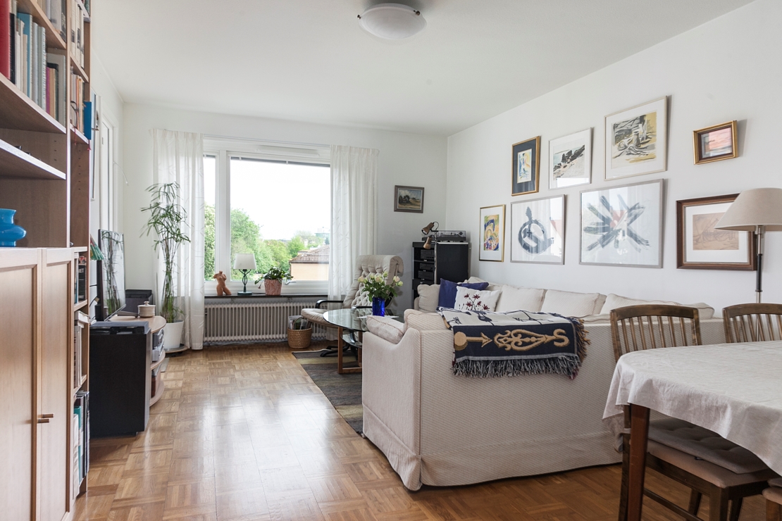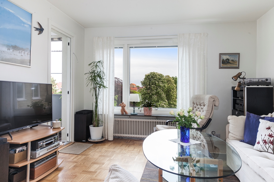 Stort vardagsrum med stora fönster som ger ett härligt ljusinsläpp i rummet. På golvet ligger ett välvårdat parkettgolv och ljusa väggar. Här finns plats för kombinerad möblering av soffgrupp med TV-hörna samt matplats för 6-8pers om så önskas.