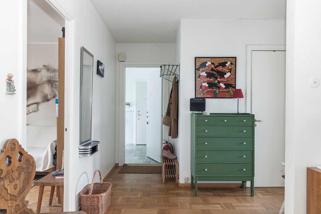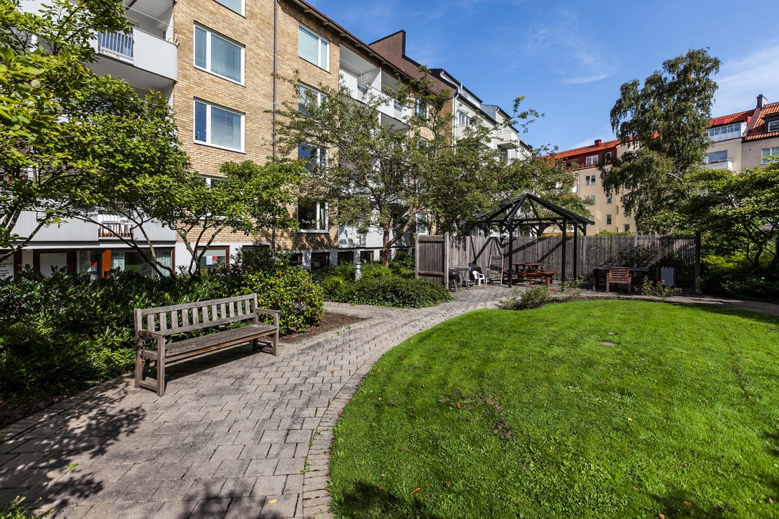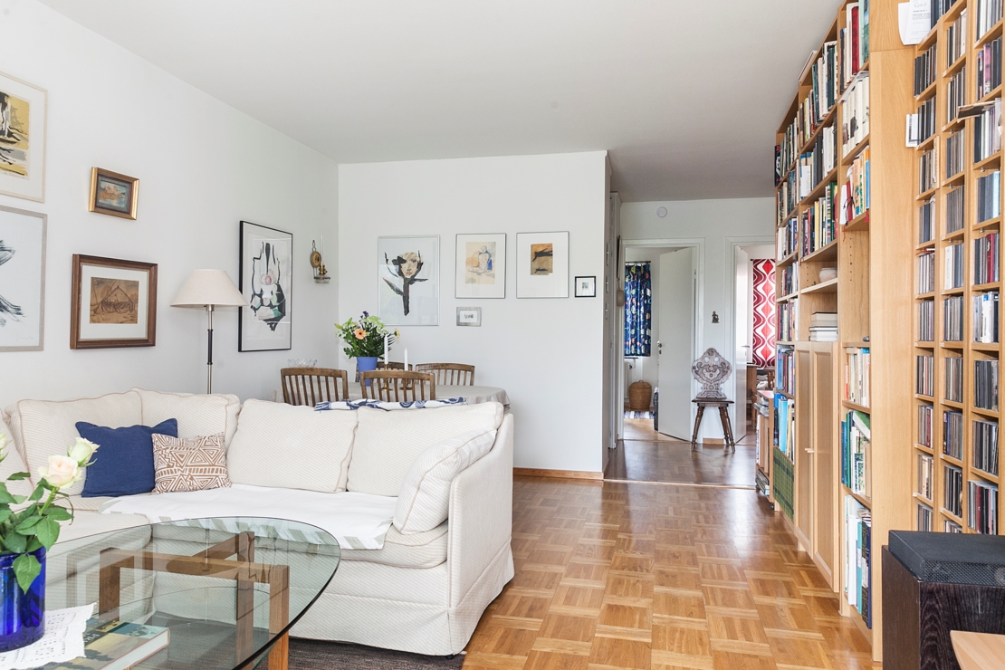 Vi tar hissen från entréplan upp till fjärde våningen och når denna genomgående och charmiga lägenhet. I hallen möts vi av en luftig känsla med goda avhängningsmöjligheter samt enkel vidarepassage till resterande rum. Köket erbjuder ett fint platsbyggt originalkök rikligt med förvaringsutrymme, bra arbetsyta och plats för en matplats till 4-6pers. Det stora vardagsrummet ger plats åt en större soffgrupp med tv-hörna samt matplats till härliga middagsbjudningar. Härifrån når vi ut till den stora balkongen i söderläge med en fullt fungerande markis för att kunna ge skugga under de varma sommardagarna. De båda sovrummen ligger strategiskt placerade med fönster ut mot den lugna innergården. Sovrummen kan med enkel möblering få in både dubbelsäng och förvaringslösning. Mellan vardagsrummet och sovrummen finner ni en rejäl förvaringsdel utrustat med klädkammare samt garderober på båda sidor för enkel åtkomst.