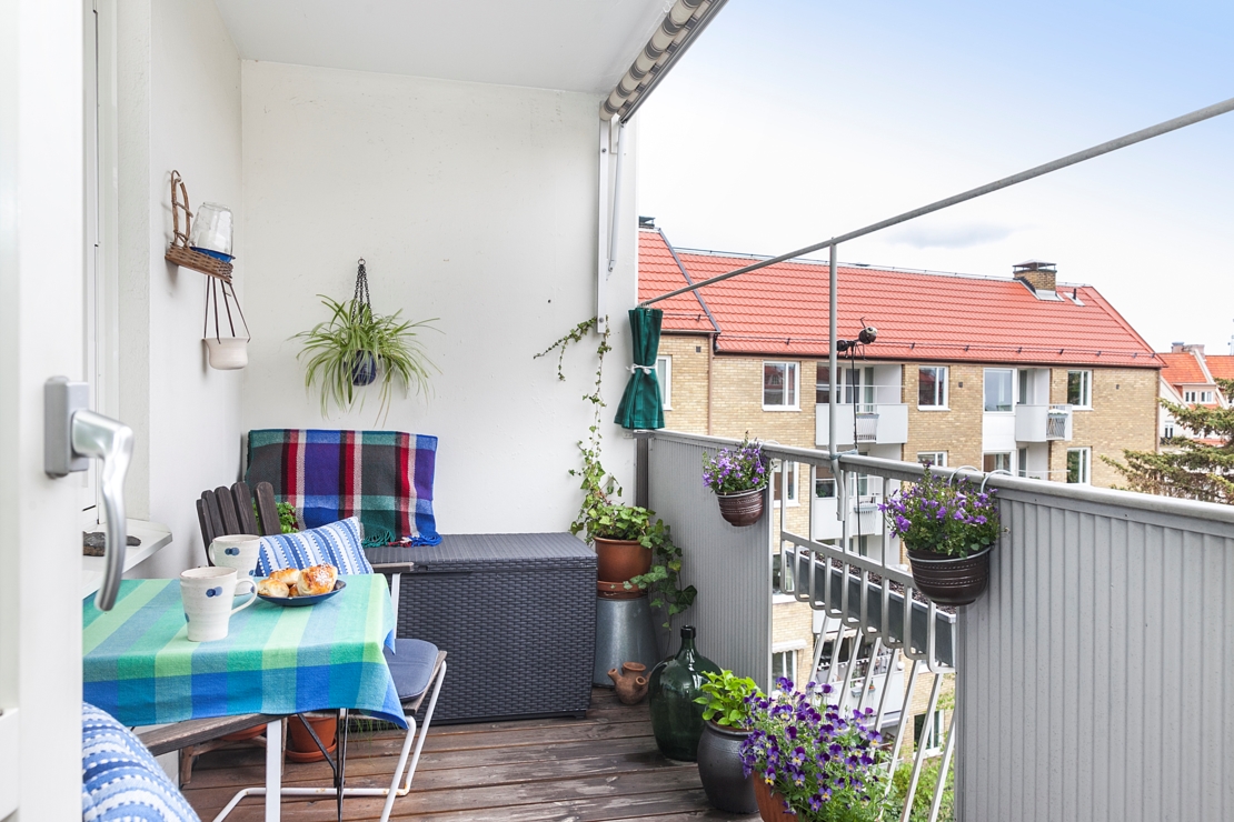 Stor balkong i söderläge med fullt fungerande markis som kan skugglägga de soliga sommardagarna. Härlig utsikt över Kopparmölleparken och grönska.