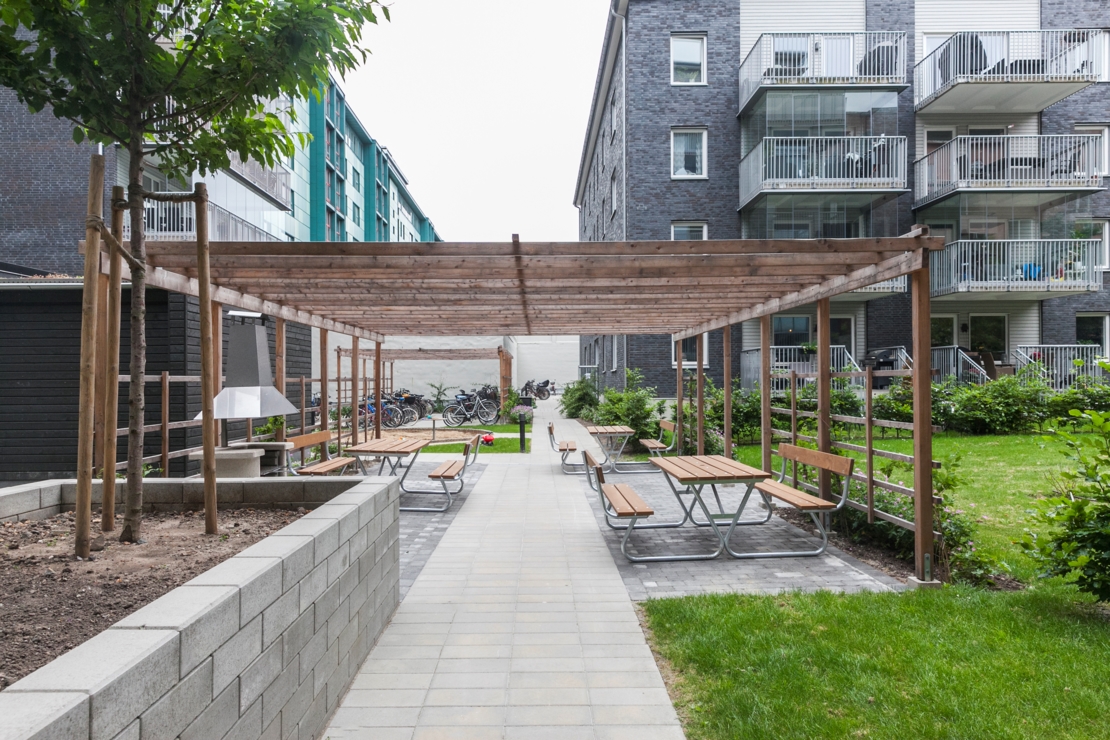 Föreningen erbjuder en grönskande och lummig innergård med plats för att parkera cyklar under vackra pergolor.
