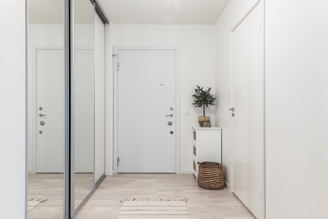 En ljus och luftig hall med genomgående golv i ljusa toner. Tillvänster om ingången finner ni en rejäl garderob med skjutdörrar med spegelglas med inbyggt elfa system.