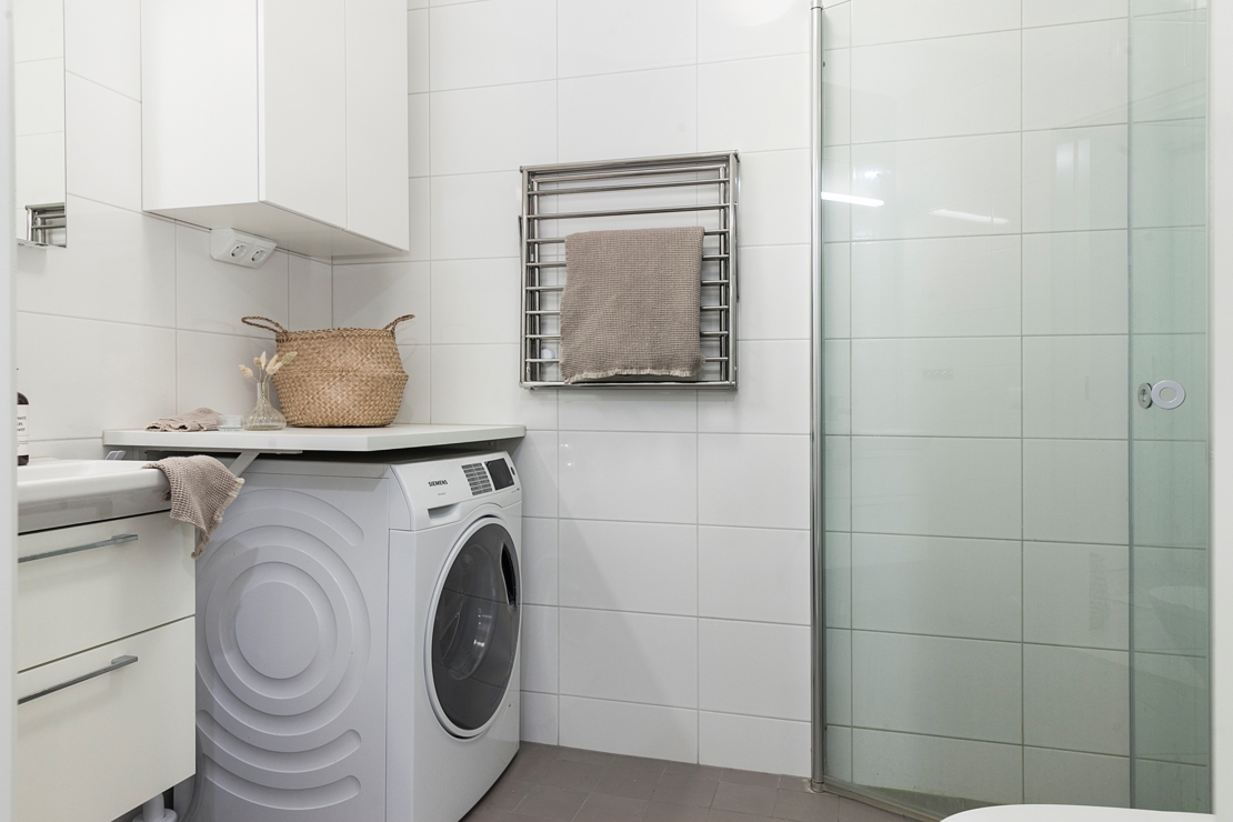 Ett helkaklat badrum med vita vägar och grått golv. Utrustad med en kombi tvätt/tork maskin (Siemens), arbetsbänk, dusch med duschväggar, handdukstork och kommod med spegel.