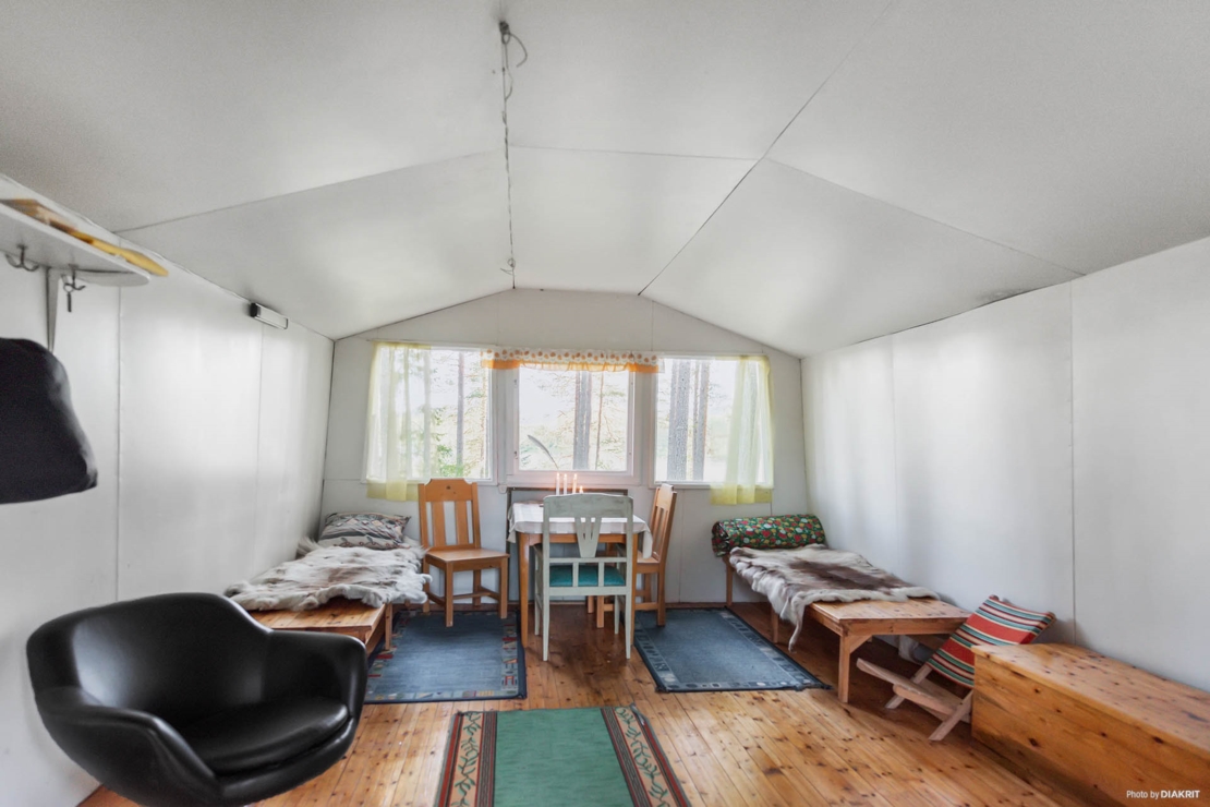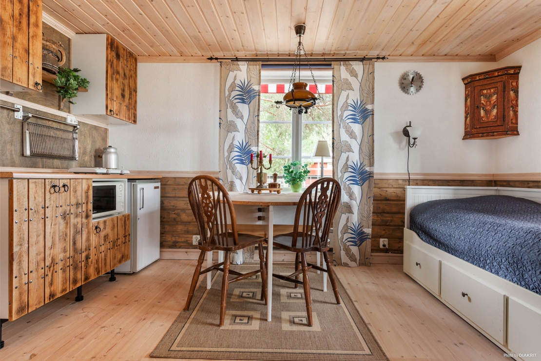 Gäststugan har renoverats under de senaste åren med stil som passar in i miljön. Där finns ett allrum med kök och ett sovrum.