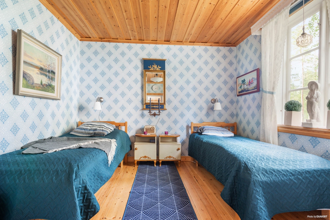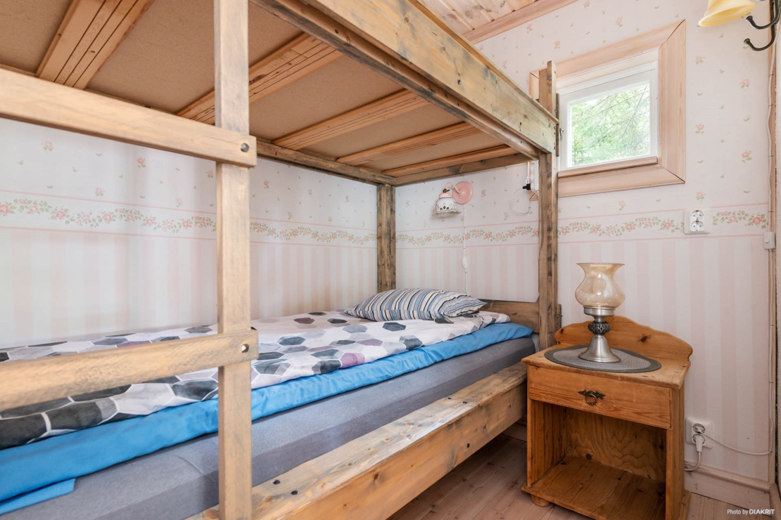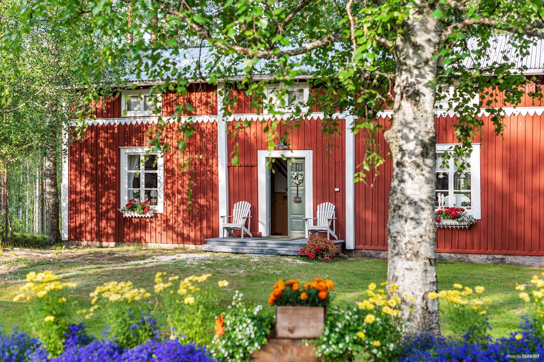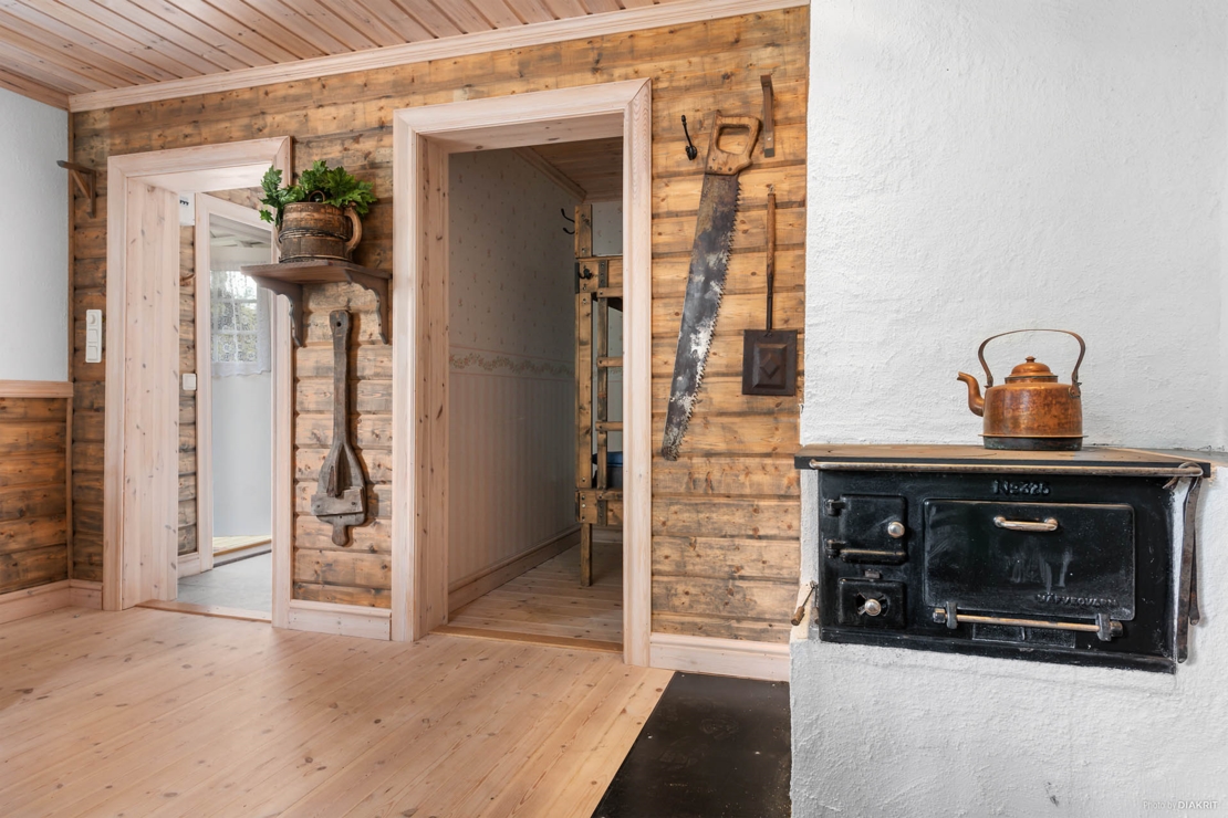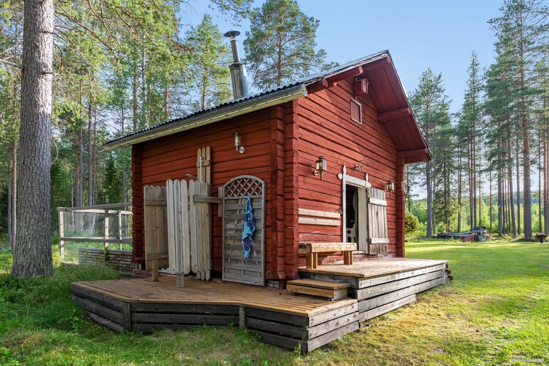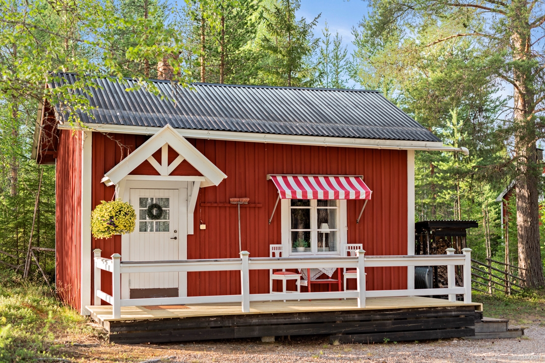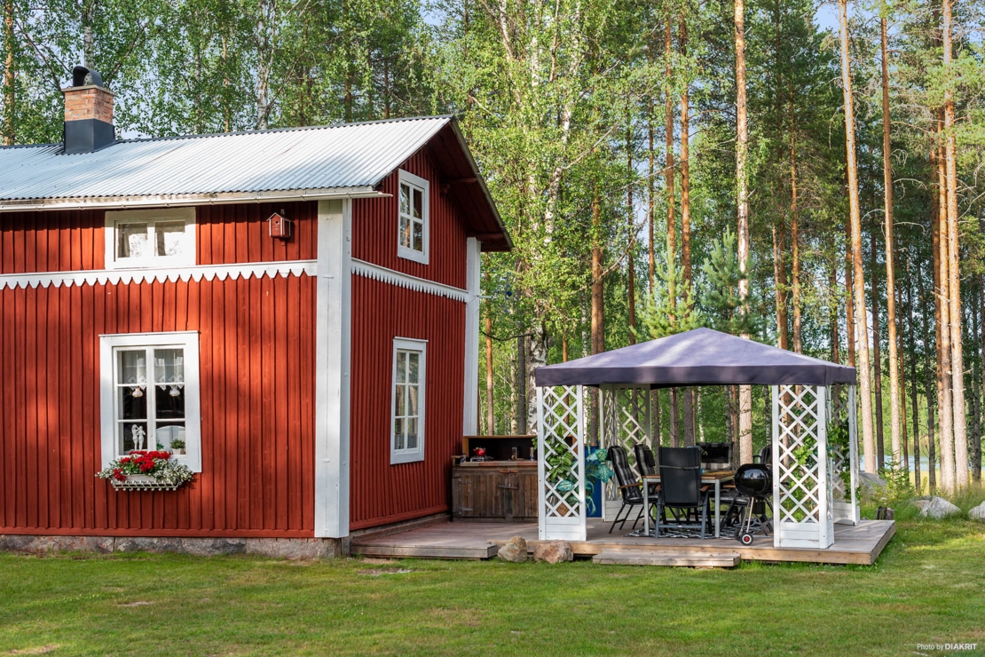Huvudbyggnaden har timrade väggar och består av 2 rum och kök. Alla rum och köket har egna kaminer. Fina handgjorda inredningsdetaljer i alla byggnader. Vidbyggd altan med paviljong och utekök. Från gården har man utsikt över Kalixälven.