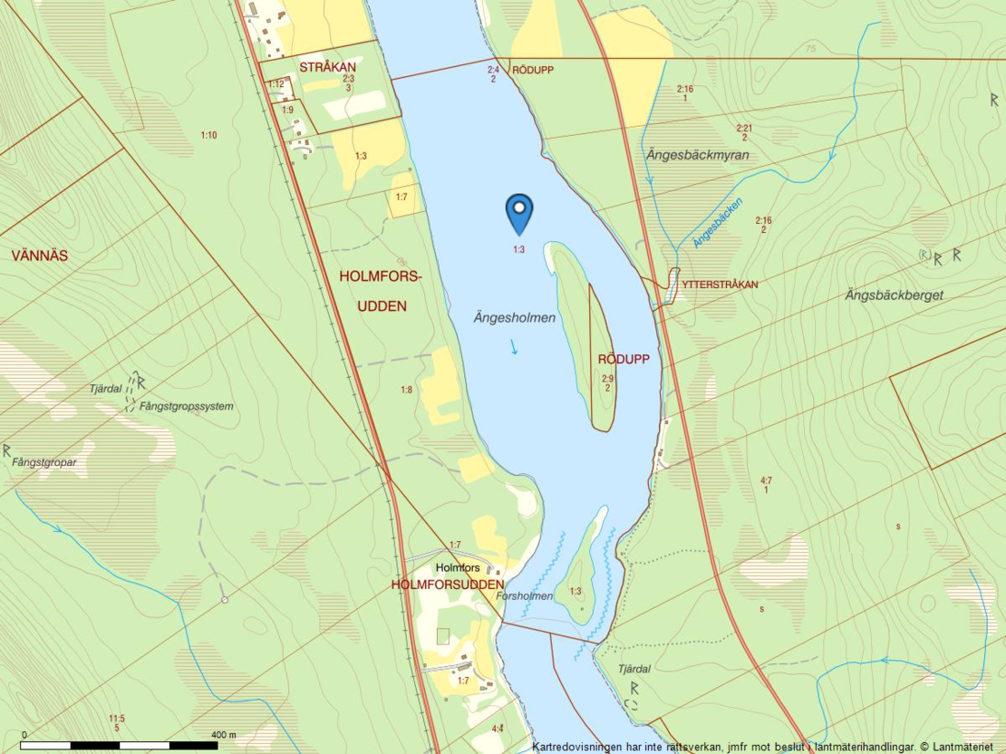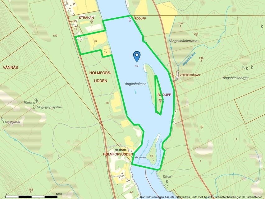 Till fastigheten hör 55 ha vattenområde samt den 1,7ha stora Forsholmen som omges av forsar och 2,7ha av den ca 5ha stora Ängesholmen. Se kartan. På egna holmen finns en mindre fiskestuga med vedeldad spis.