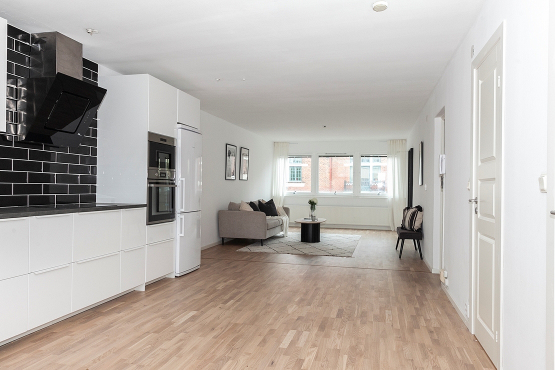 Öppen planlösning mellan kök och vardagsrum som skapar ett härligt ljus och stora ytor. Här finns goda möjligheter för att placera en köksö eller ett större matbord omså önskas.