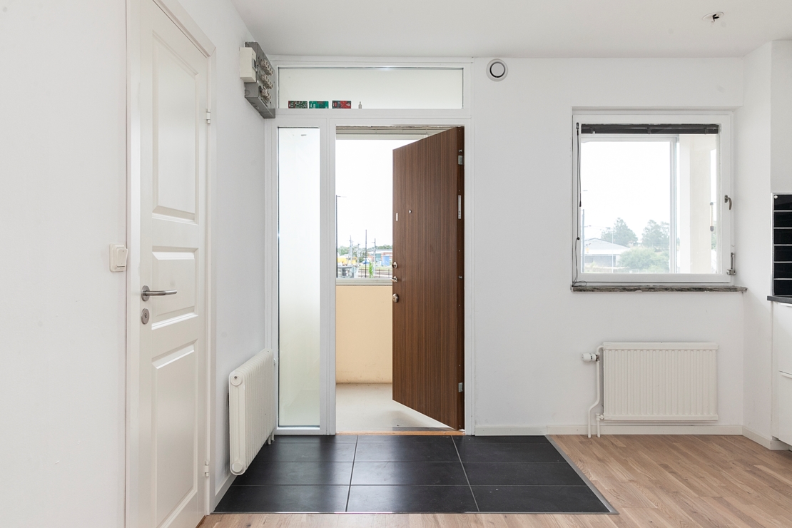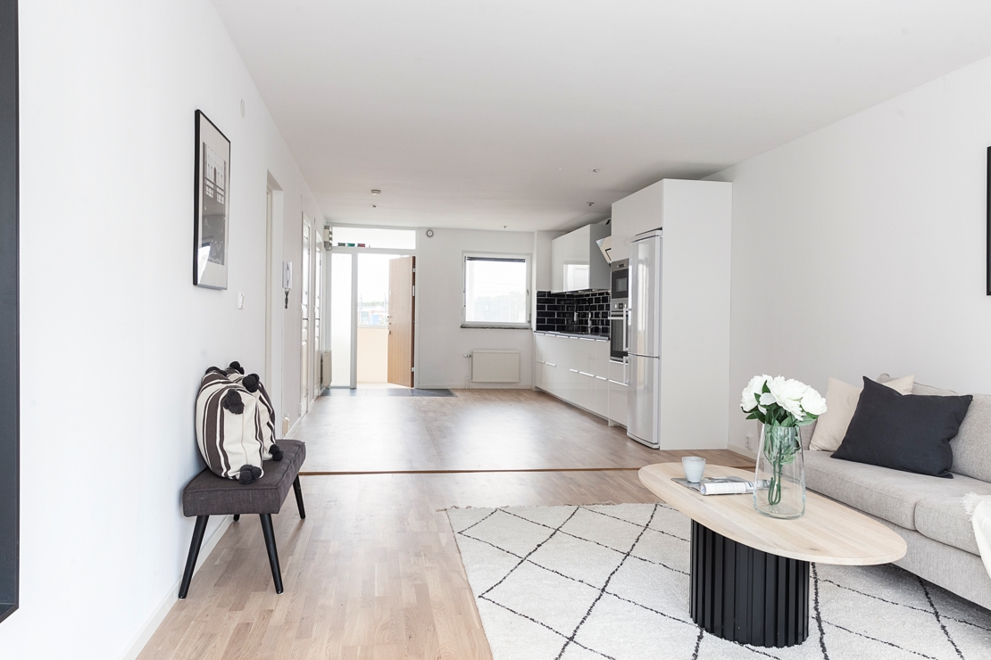 Luftig och ljus hall med full utsikt över kök och vardagsrum.