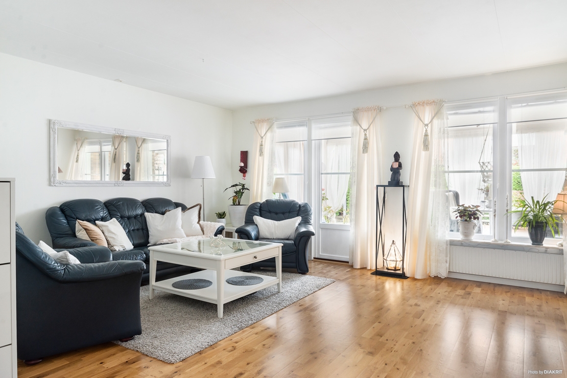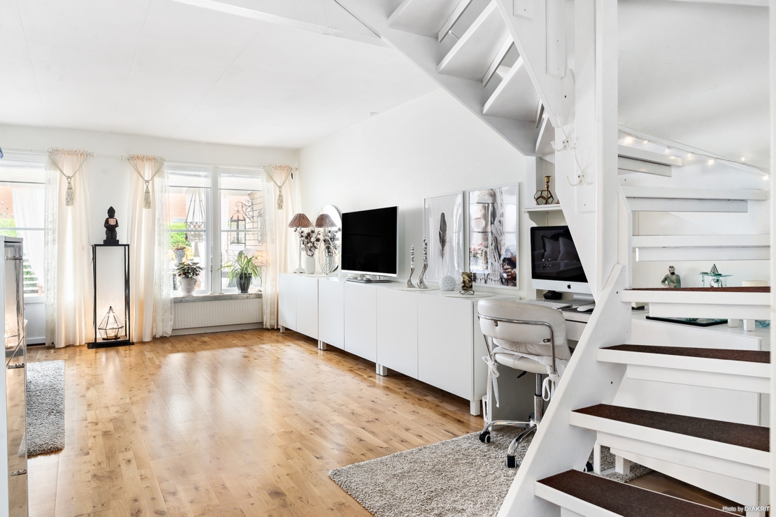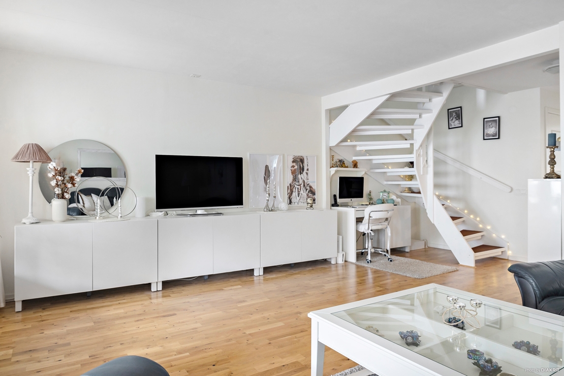 Stort ljust vardagsrum i vita toner. Lätt möblerat med större soffgrupp, tv-möbler samt en arbetshörna om så önskas. utgång och stor fönster ut mot bostadens rymliga uteplats. Härifrån går även den vitmålade trappan till ovanvåningen.