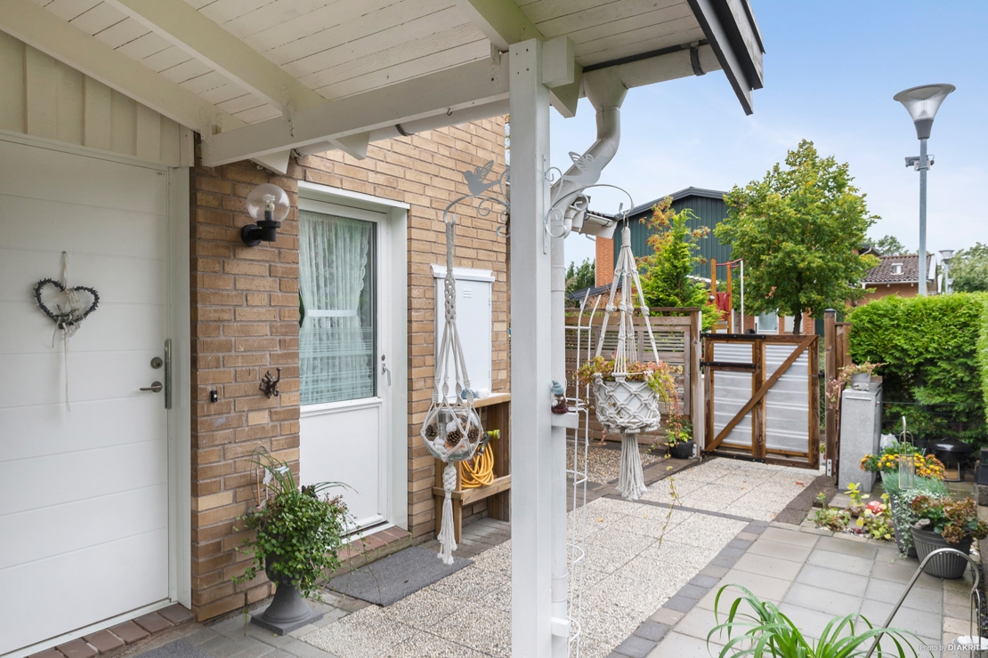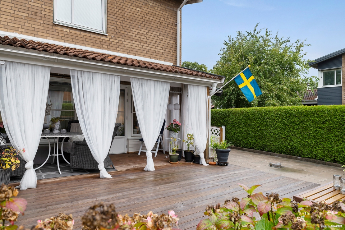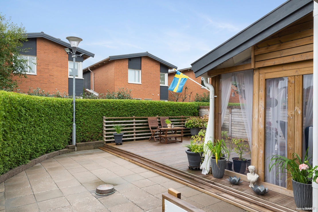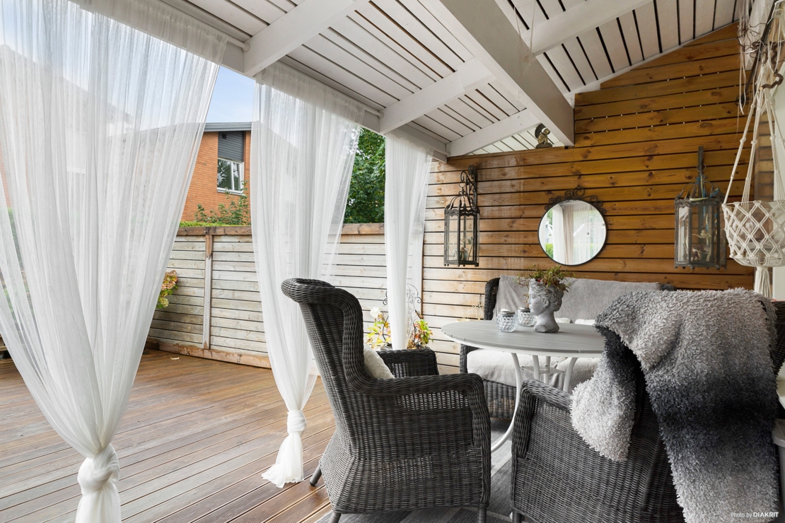 Insynsskyddad uteplats med förlängt tak, trätrall och stenläggning. Plats för såväl matplats och loungehörna under tak samt enkelt möblerat på resterande del av trätrall och stenläggning. Här kan man också ta sig runt till bostadens framsida.