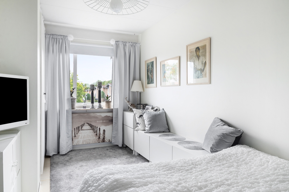 Sovrum nummer 2 med ljust golv, vita vägar och platsbyggda garderober. Här får man enkelt plats med en dubbelsäng, nattduksbord samt ett skrivbord om så önskas.