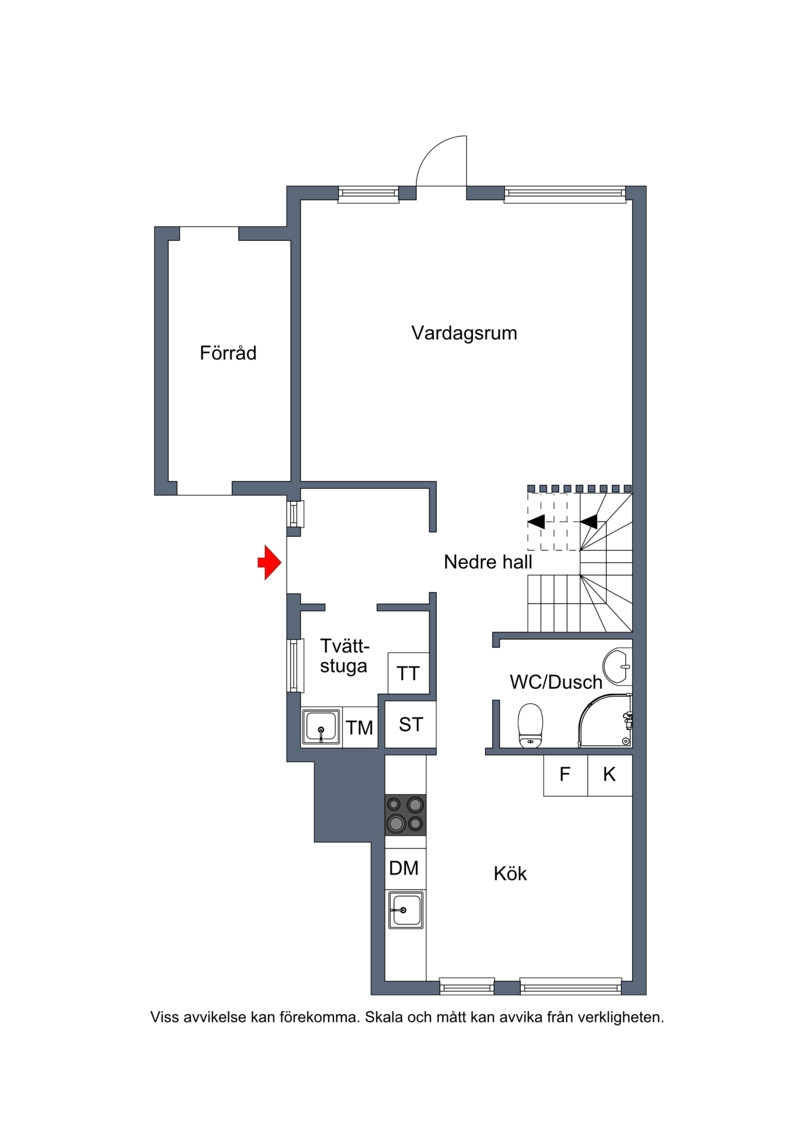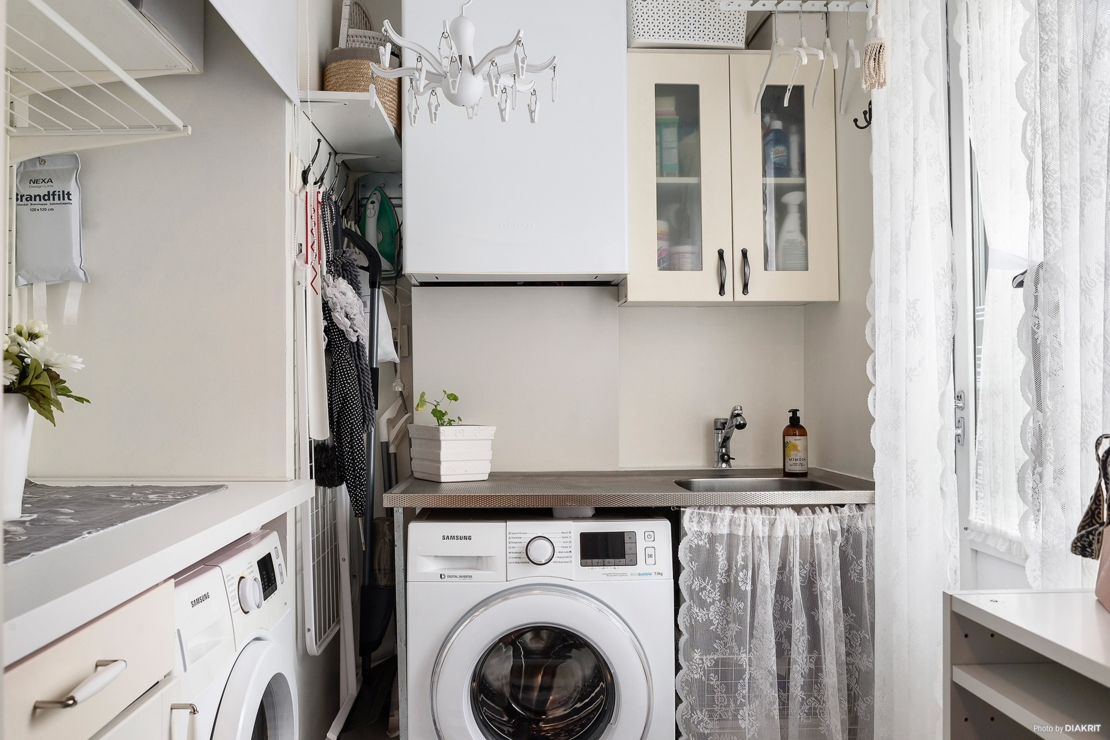 Separat ingång från framsidan för att kunna ta in barnen, hunden eller annat en regnig dag. Utrustad med tvättmaskin(Samsung) och torktumlare(Samsung), arbetsbänk med vask samt förvaringsskåp både på golvnivå samt vägghängda.