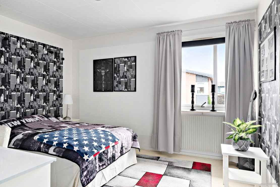 Större av två sovrum med egen klädkammare. Plats för dubbelsäng, nattduksbord, skrivbord och vägghängd tv. Ljust golv och vita väggar med tapetserad fondvägg.