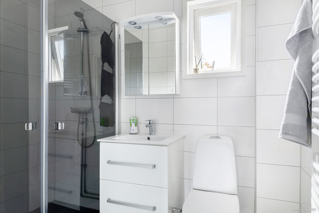 Renoverat badrum sedan 2016 (Av auktoriserad firma) med ett ljusgrått golv, vit kaklade väggar, duschhörna med glasdörrar, kommod med vask med spegel.