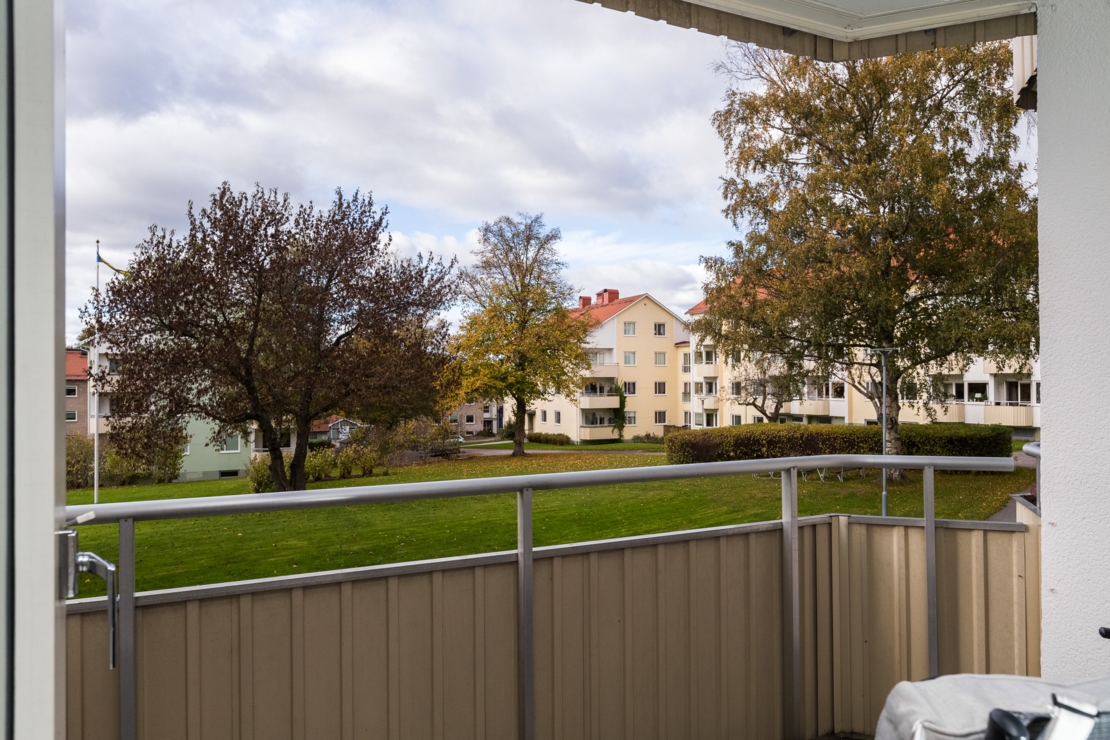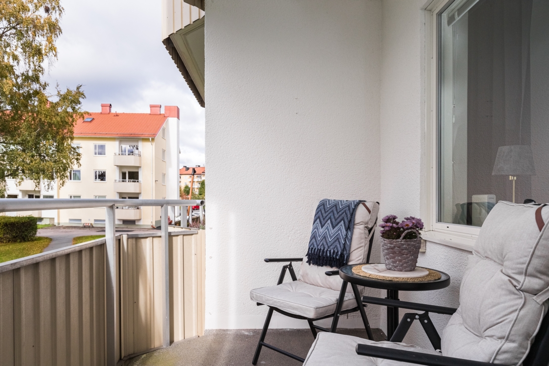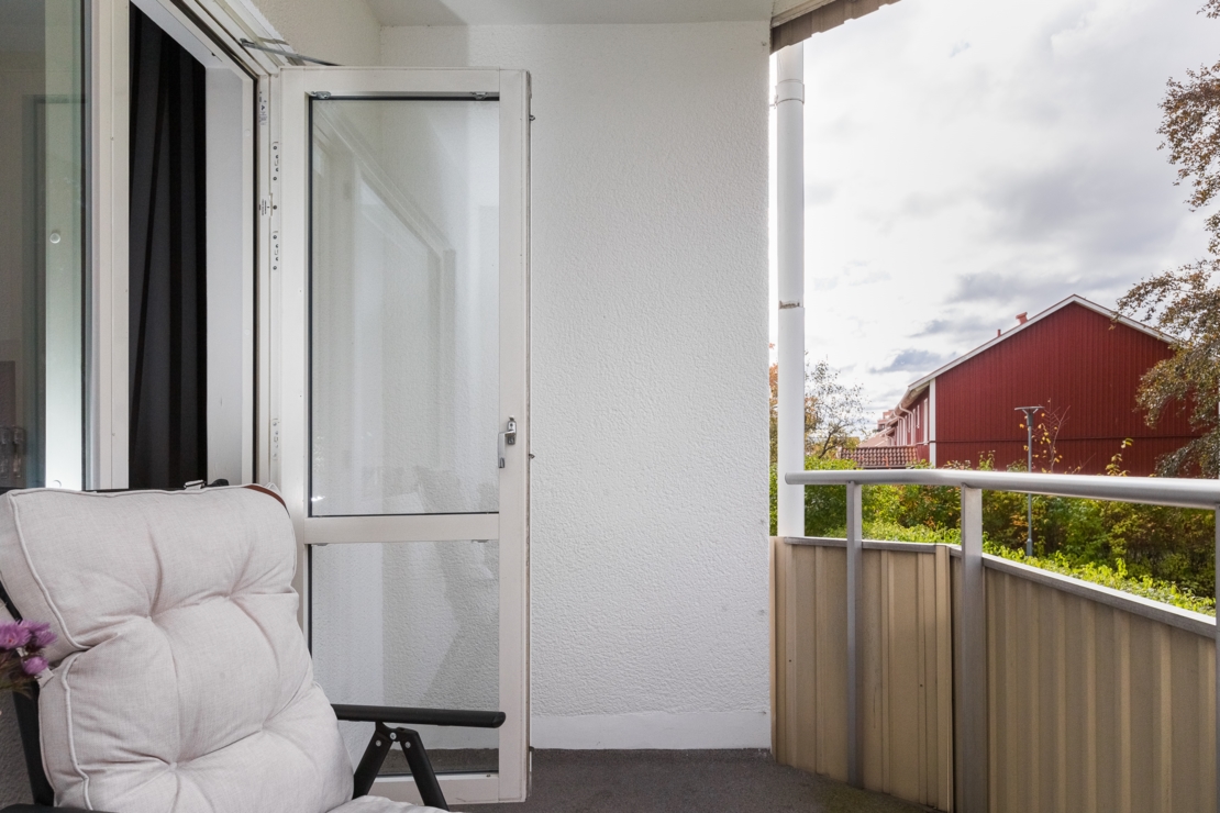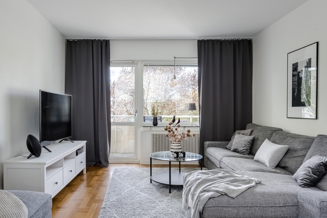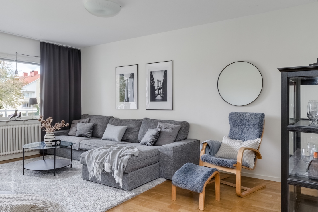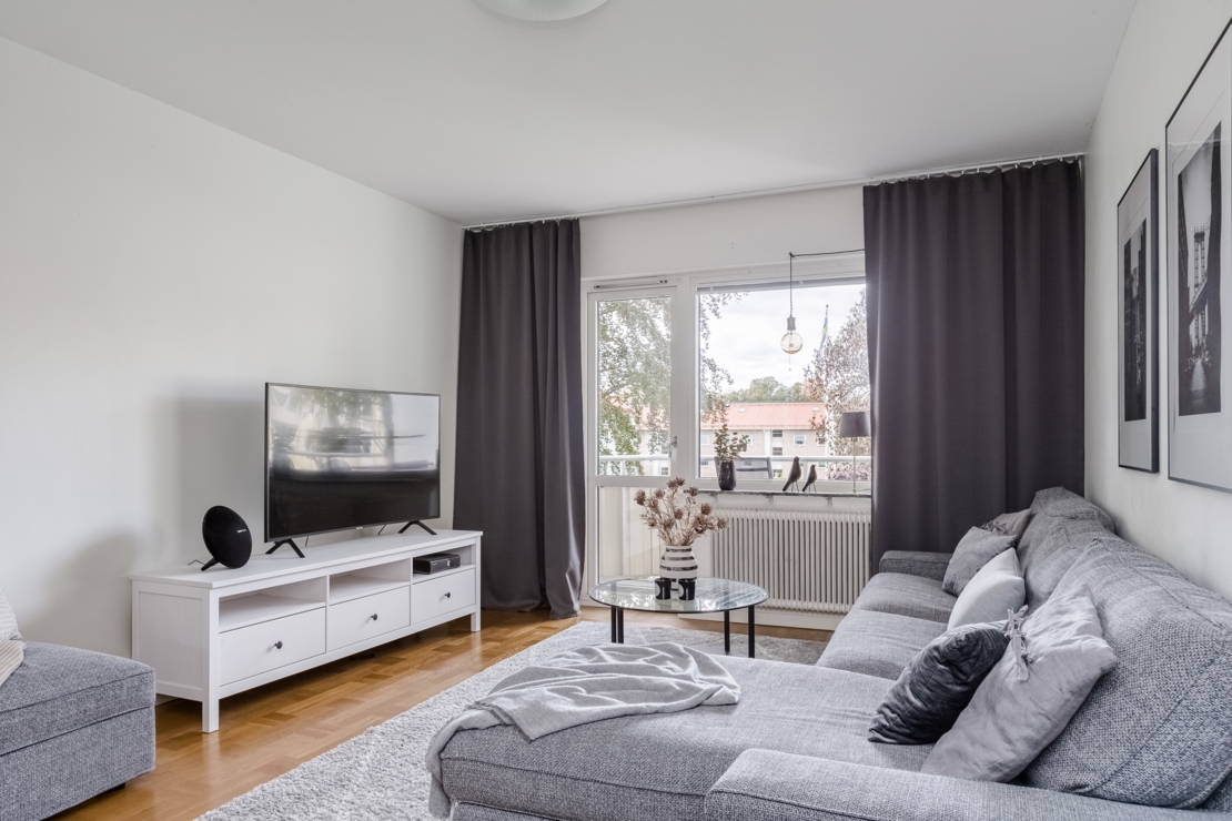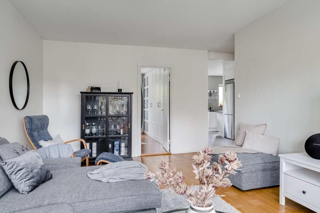 Här har man ett stort allrum med gott om plats för de stora sällskapet. Stora fönsterpartier med härligt ljusinsläpp. Anslutning till balkong. Vita väggar. Parkettgolv.