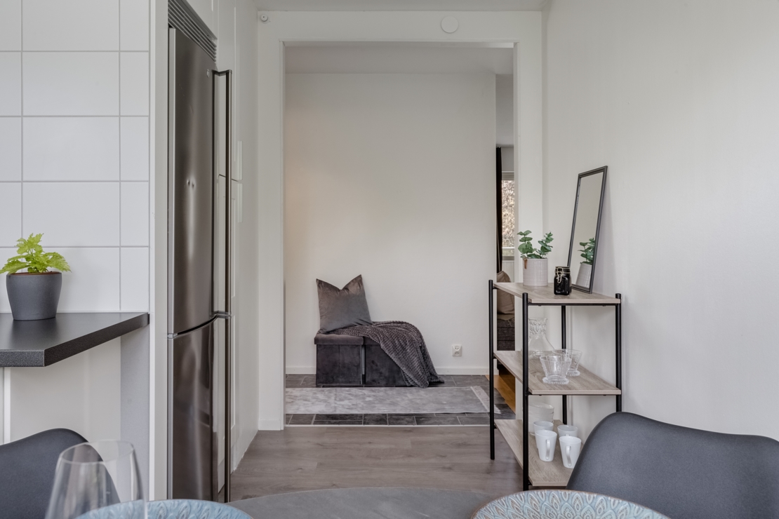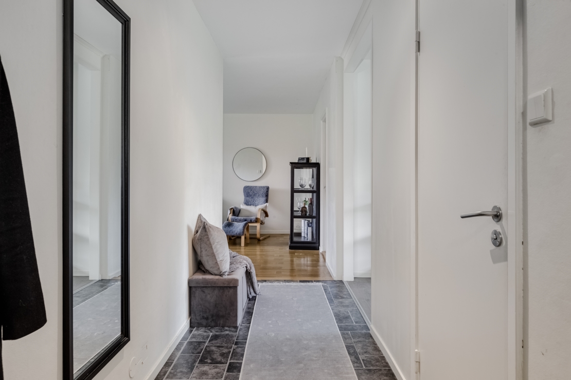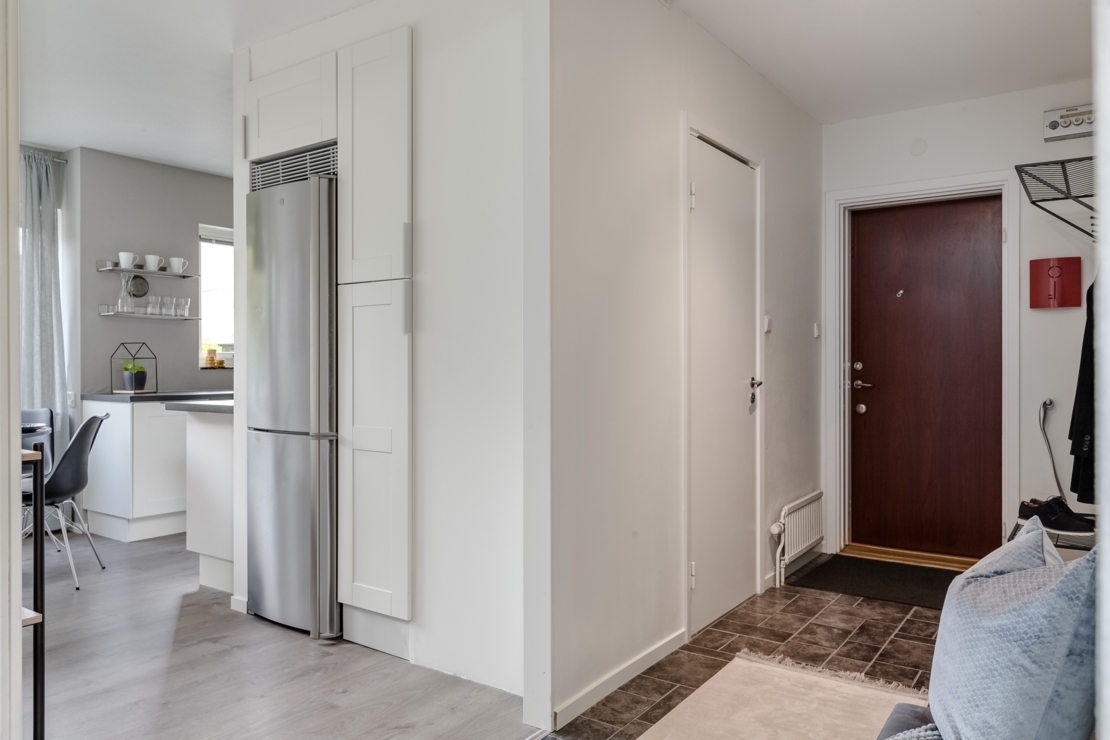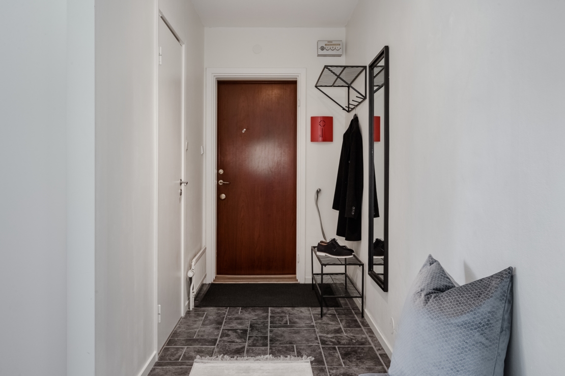 Välkomnande entré. Här finns goda avhängsmöjligheter. Laminatgolv som efterliknar svart klinkergolv. Vitmålade väggar.