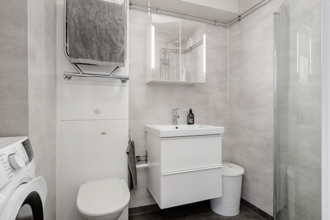 Nyrenoverat badrum. Beige våtrumsmatta på golv och väggar. Badrummet är utrustat med WC, tvättställ med förvaring, spegelskåp, dusch med vikbara duschväggar samt tvättavdelning som förenklar vardagsbestyren.