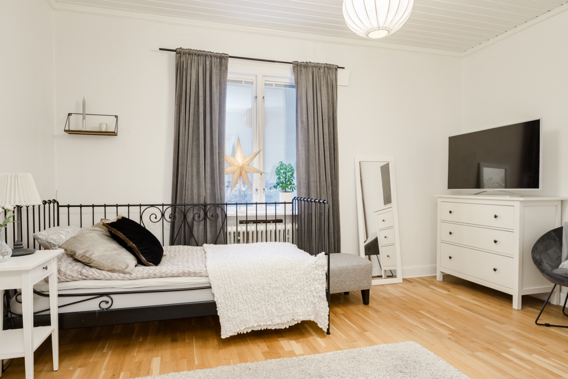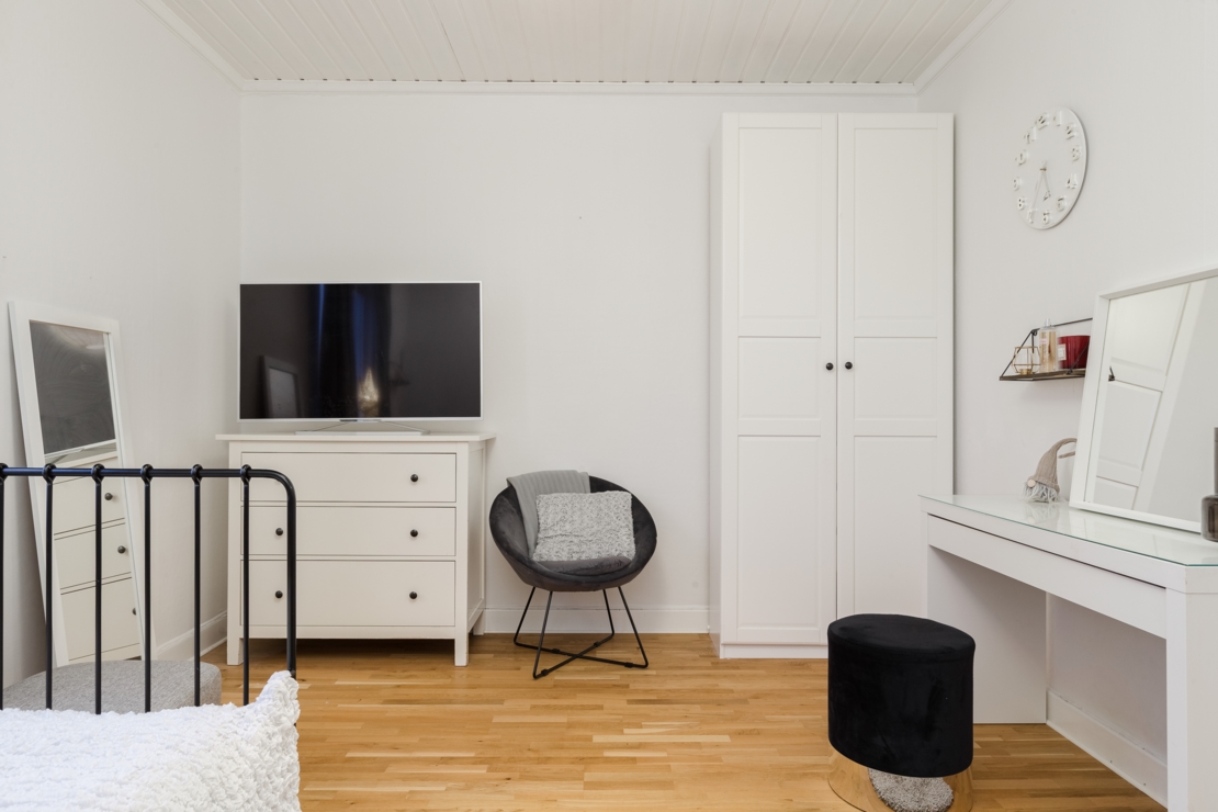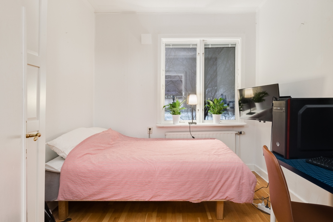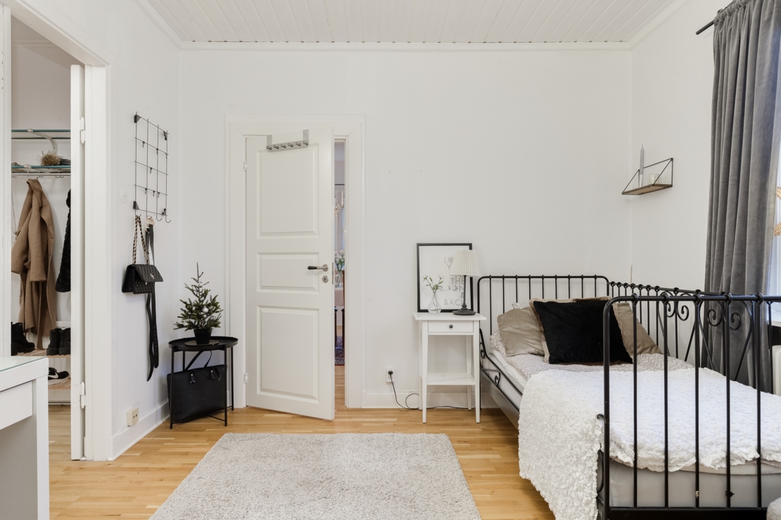 Detta rum passar ypperligt som barnens sovrum, kontor, hobbyrum eller gästrum. Vitmålade väggar och ekparkett. Bra förvaringsmöjligheter.