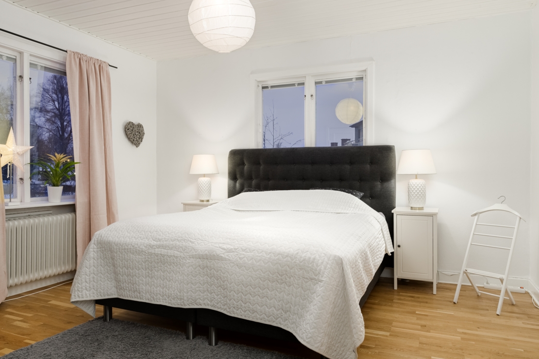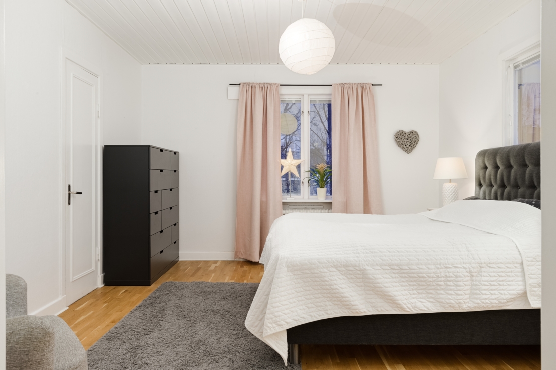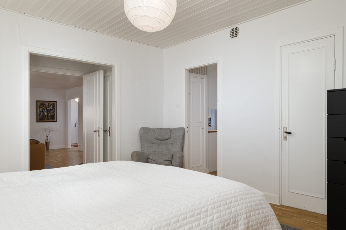Det stora sovrummet. I anslutning till sovrummet finns varsin klädkammare med platsbyggd inredning och heltäckningsmatta i grått utförande. I anslutning till sovrummet finns även badrummet. Vitmålade väggar och ekparkett.