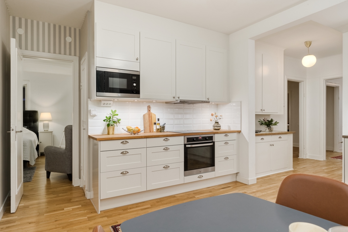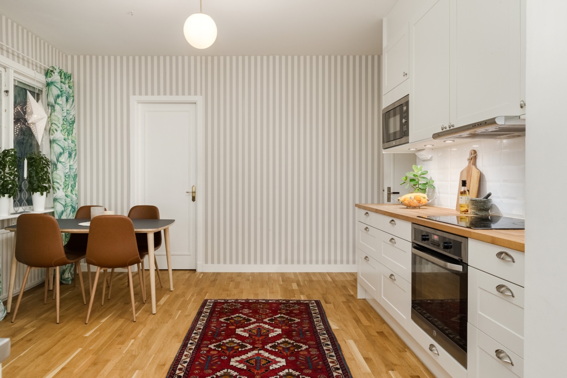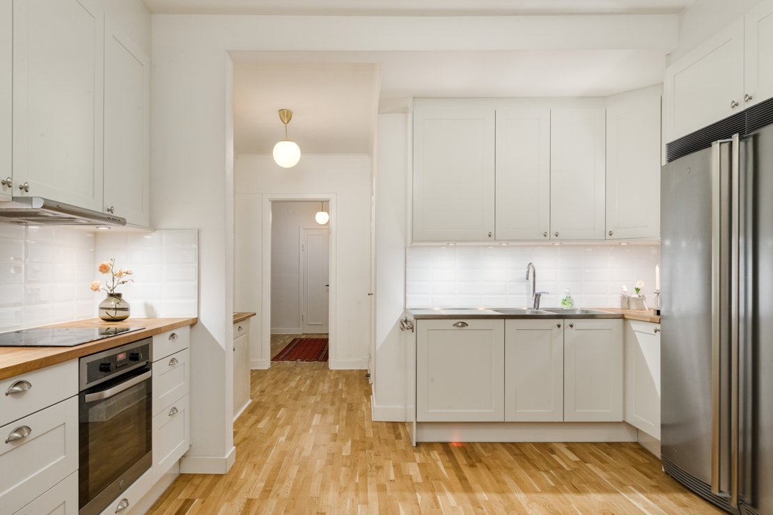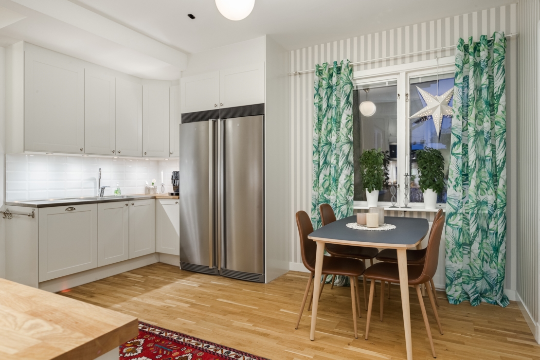 Stilrent kök från Marbodal i vitt utförande. Här erbjuds generösa bänkytor och förvaringsskåp, kakel satt som stänkpanel. Vitvaror bestående av hel frys, hel kyl, spishäll, ugn, inbyggd mikrovågsugn, fläkt och diskmaskin. Utrymme för matplats. Tidstypisk tapet på väggarna och ekparkett på golvet.