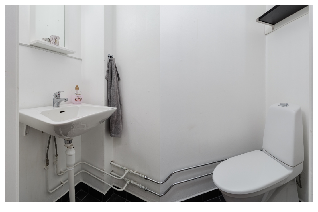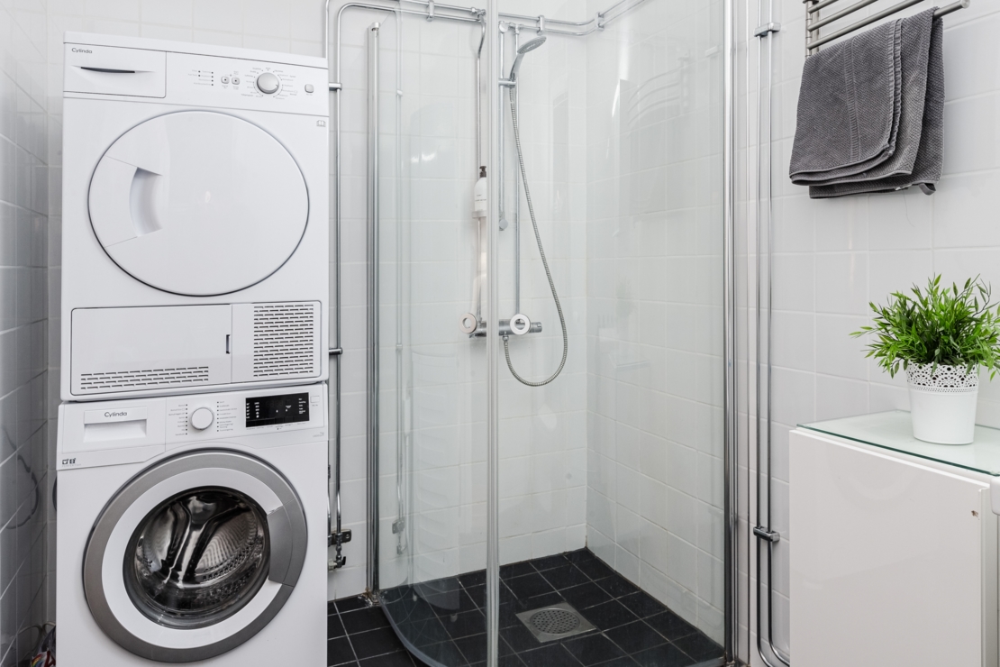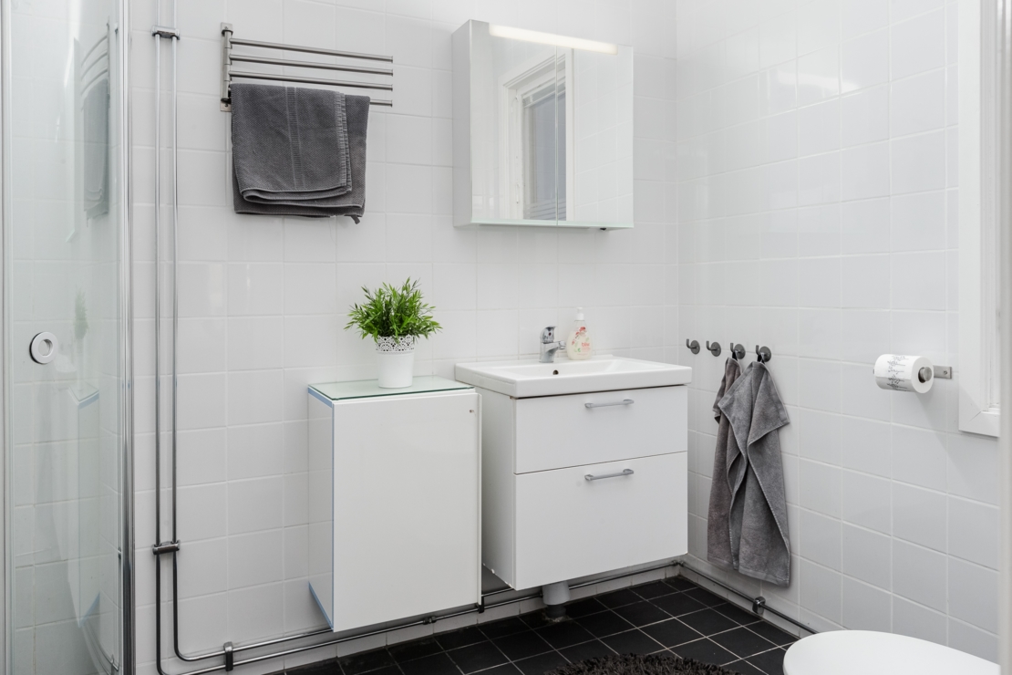 Helkaklat badrum som är rymligt och bra planerat. Inredningen består av dusch med vikbara dörrar, kommod med spegelskåp ovanför samt wc. Svart klinkergolv med golvvärme och väggar i vitt kakel. Tvättmaskin och torktumlare.