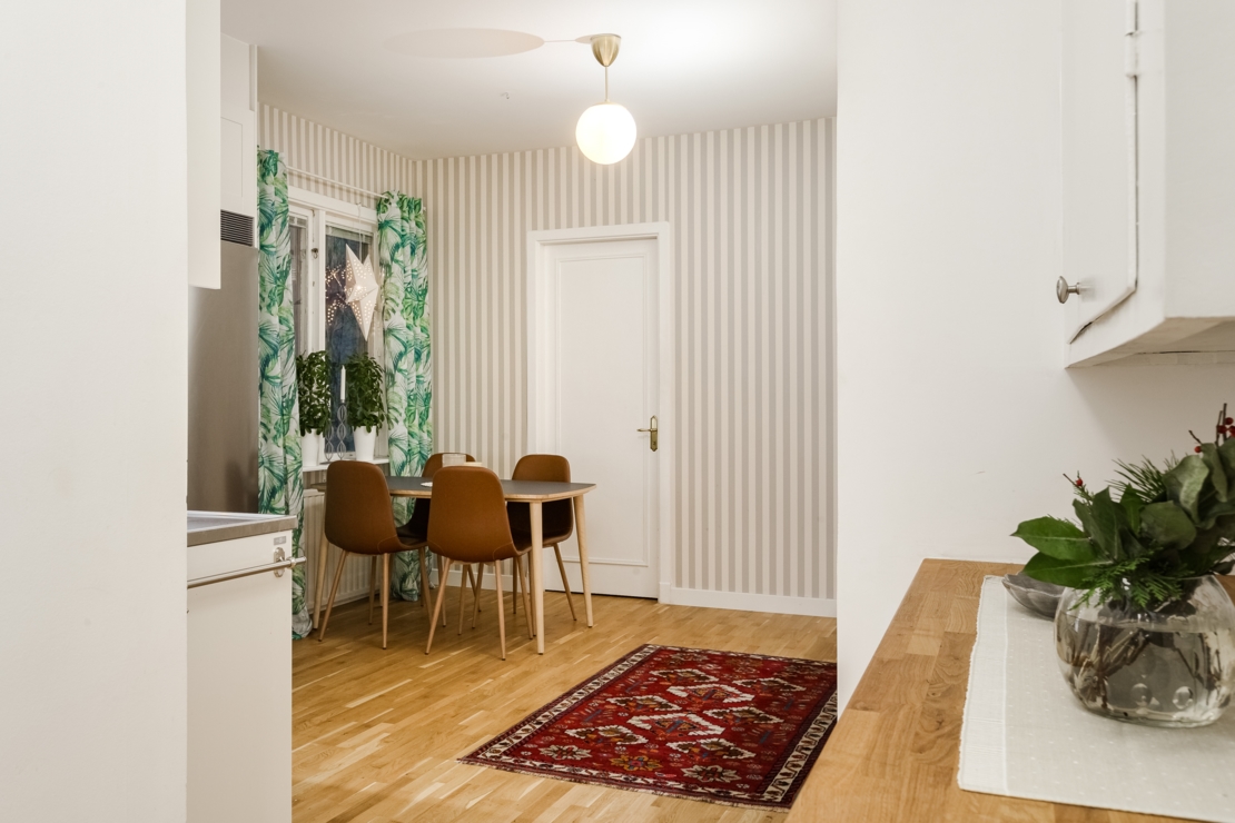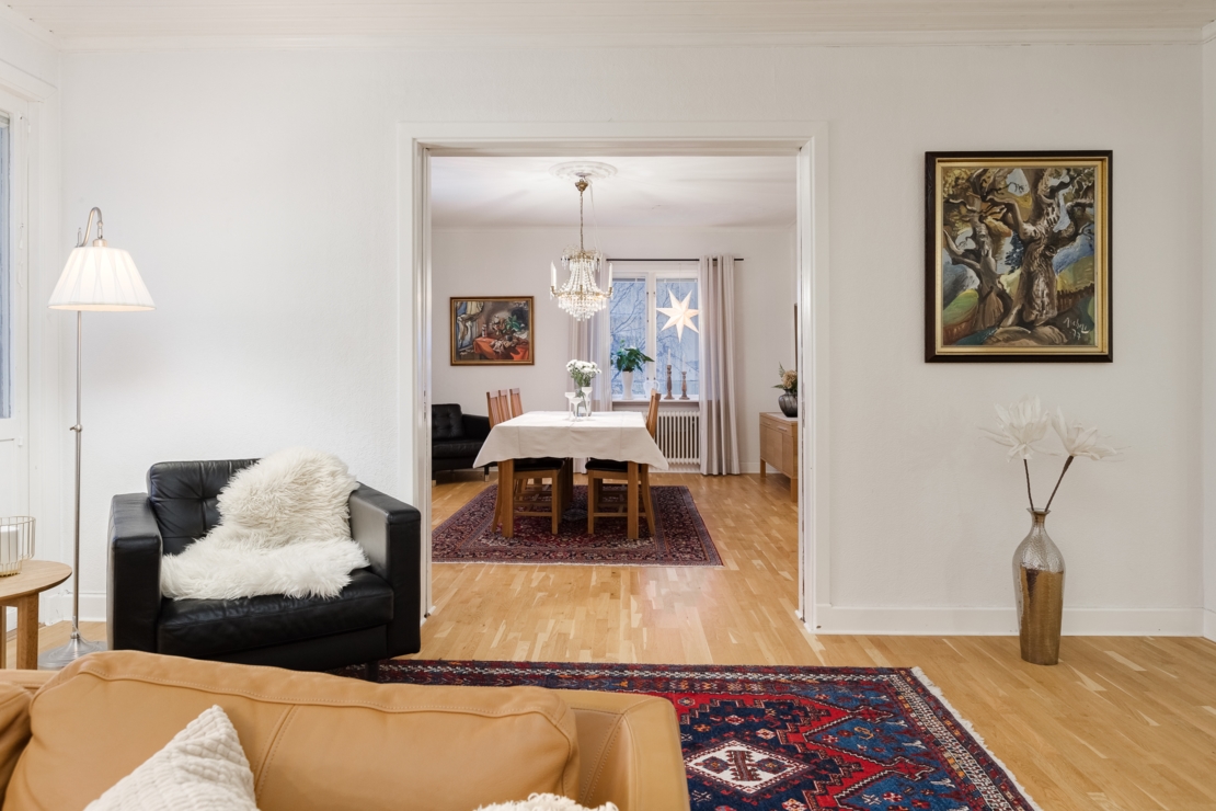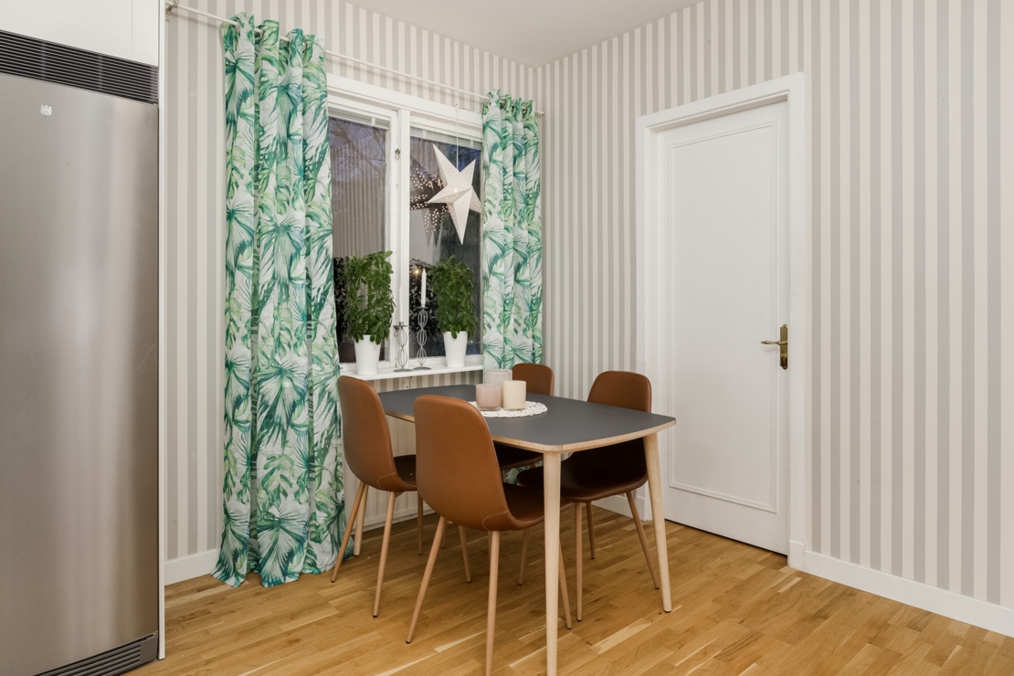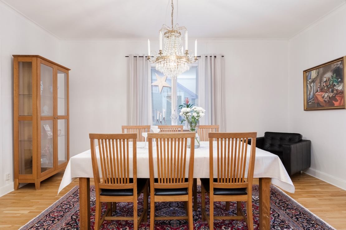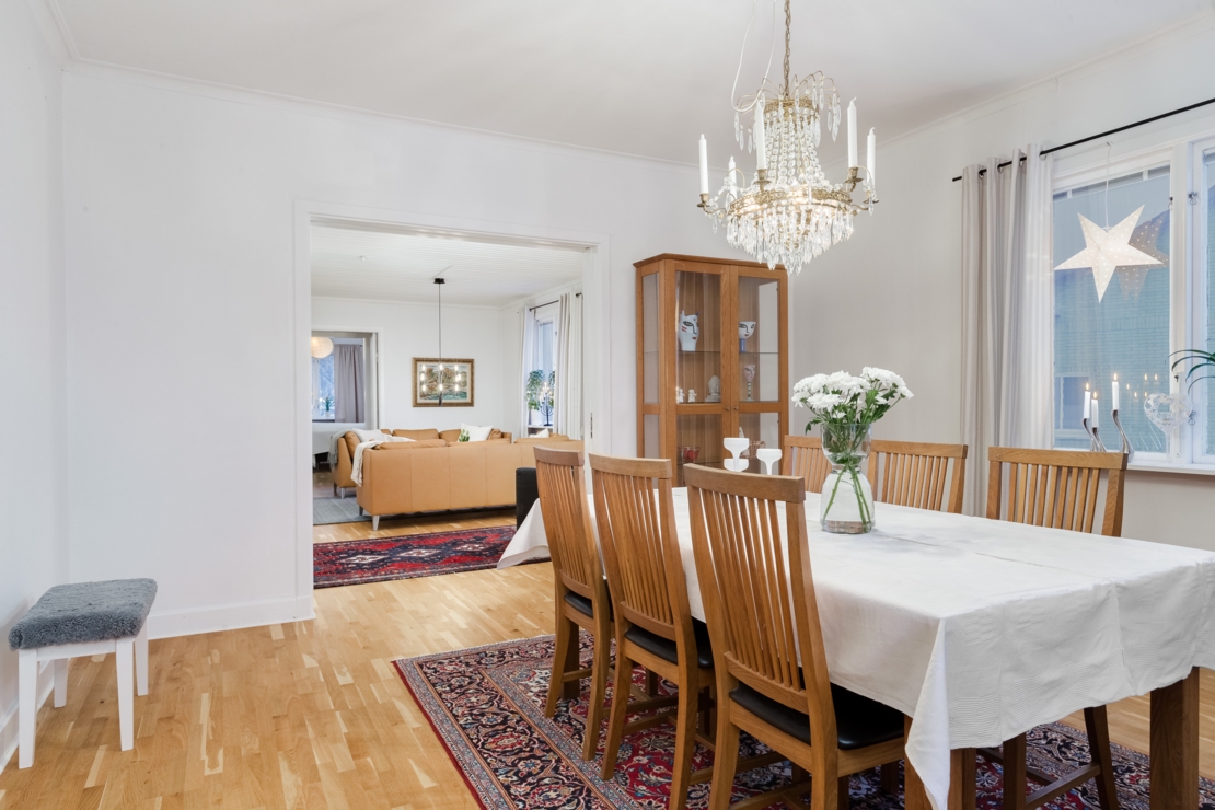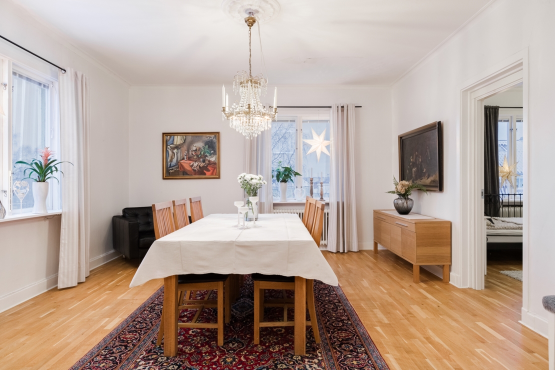 I öppen planlösning till vardagsrummet som är bostadens hjärta och perfekt för sociala sammanhang finner du såväl matsalen. I matsalen rymmer ett större matbord för stora middagar vilket gör det svårt att inte bjuda hem sällskap i vänners lag på middag. Tidstypisk stuckatur i taket. Takhöjden är luftig, och ljuset strömmar in genom stora fönster i två väderstreck. Vitmålade väggar och ekparkett på golvet.