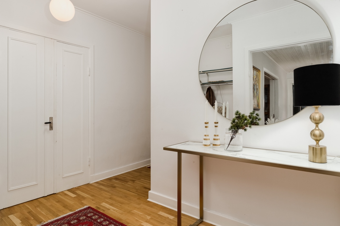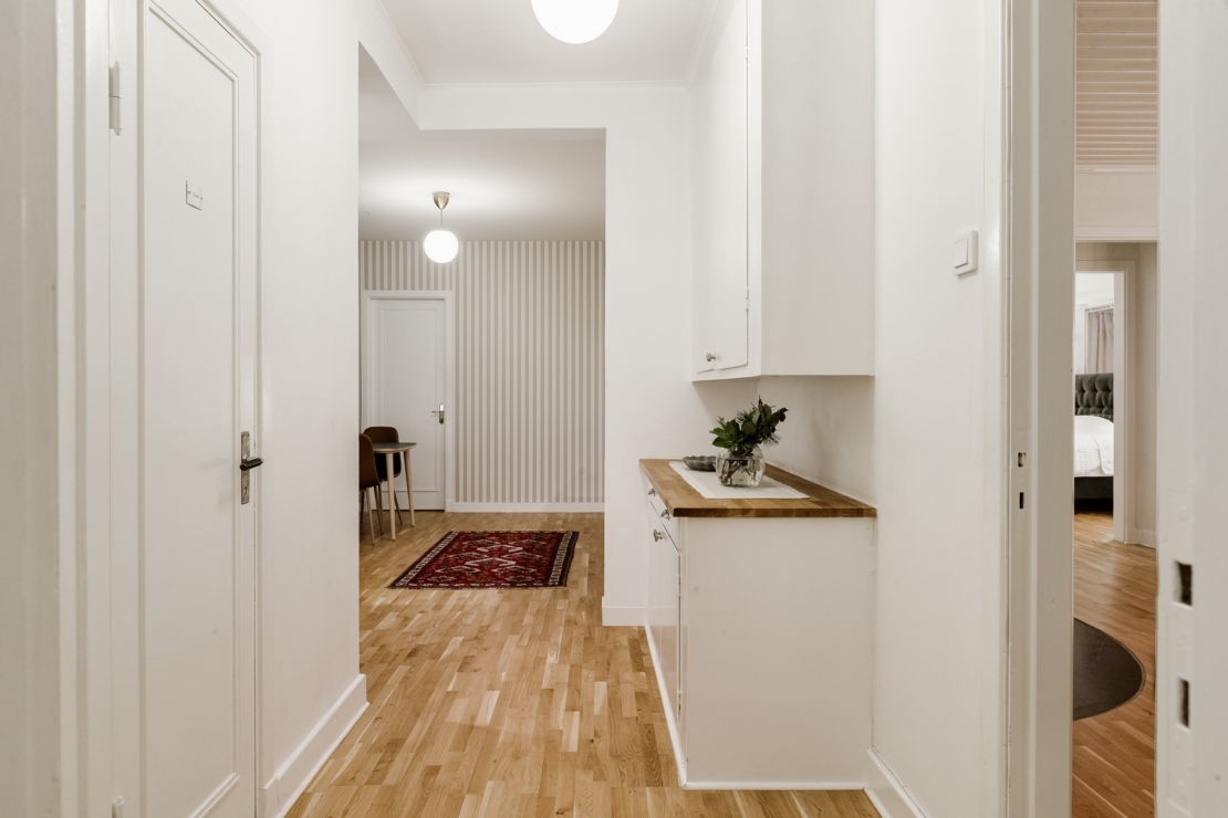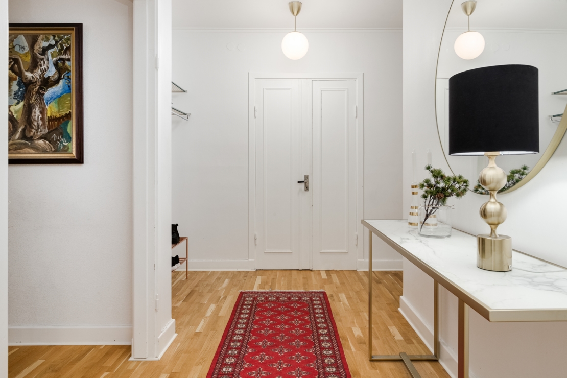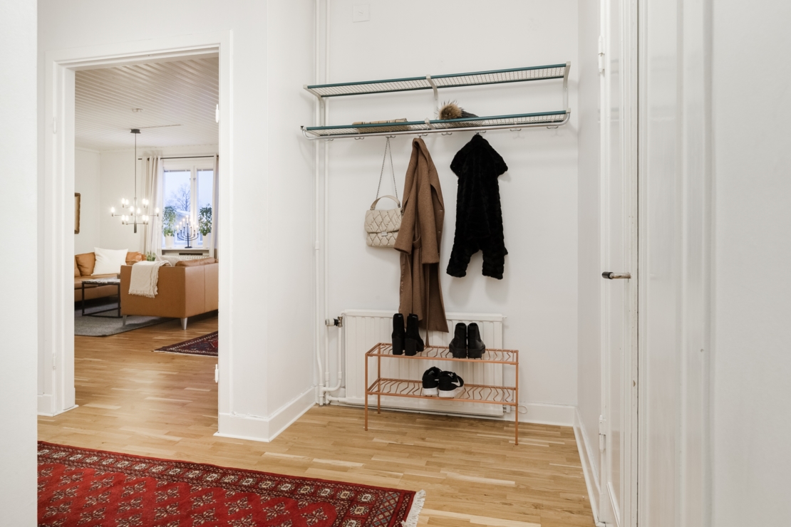 Välkomnande entré. Här finns goda avhängningsmöjligheter. Ekparkett vilket är genomgående i hela lägenheten. Vitmålade väggar.
