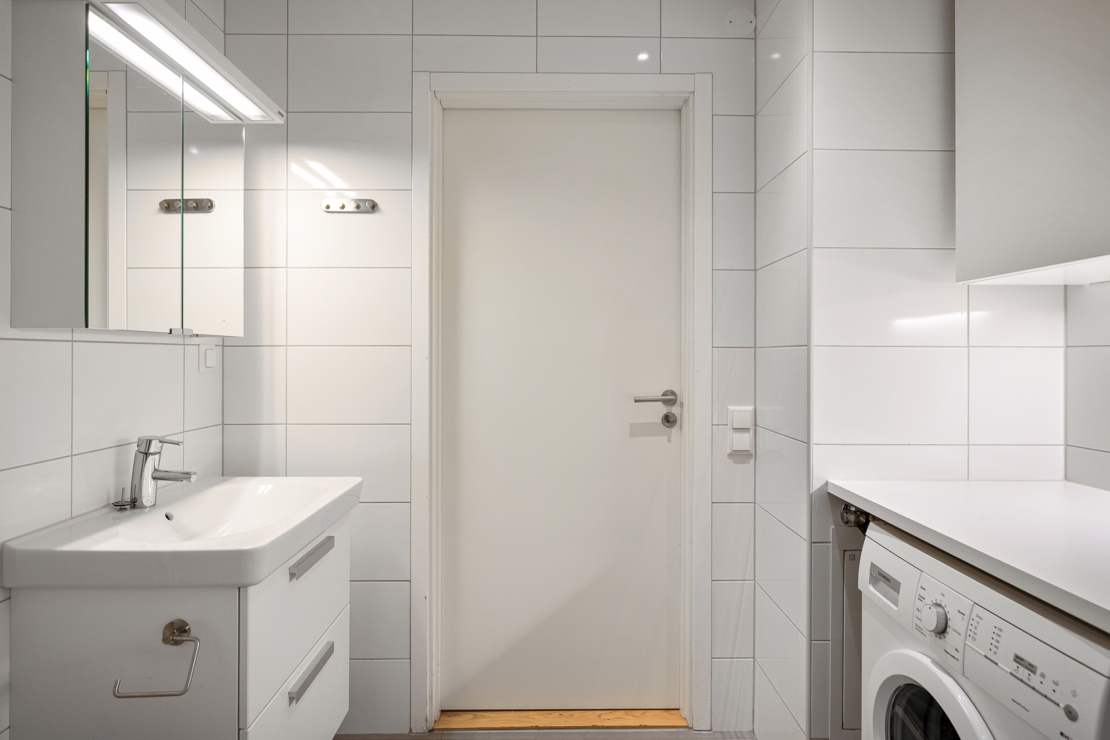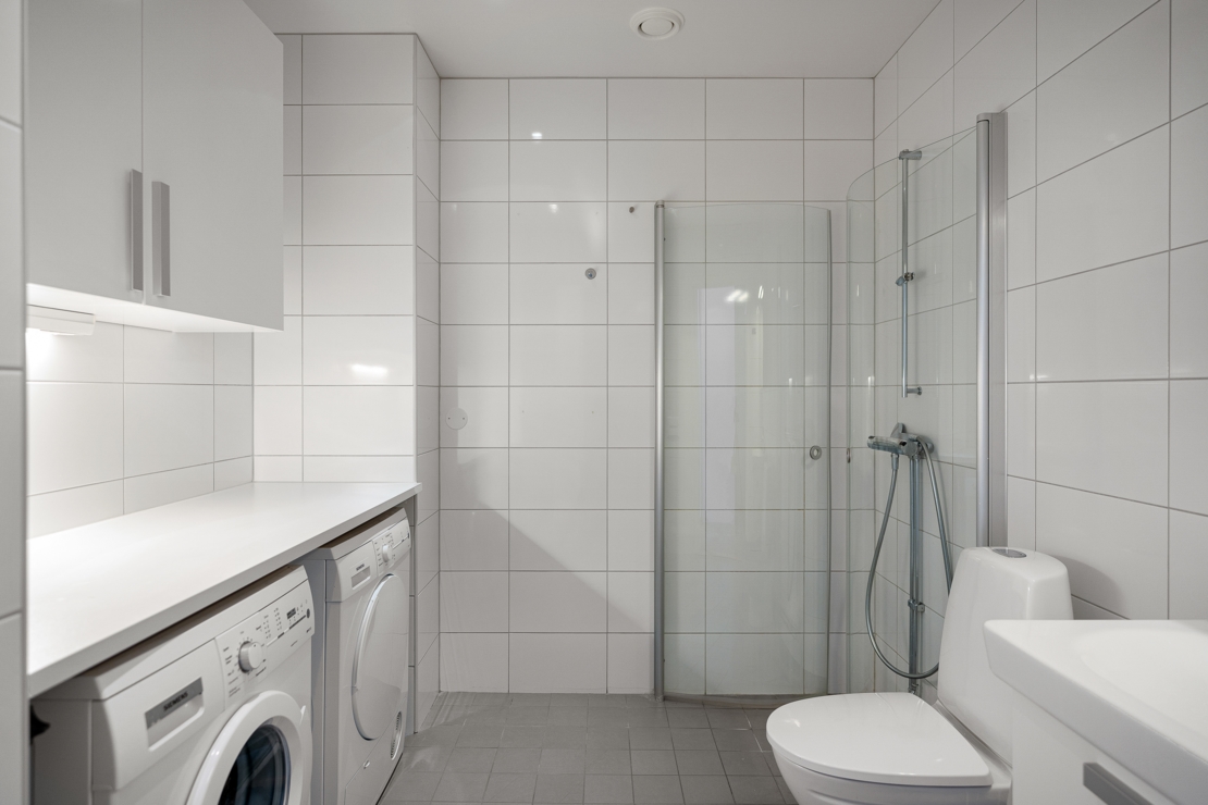 Fräscht och rymligt badrum med dusch. Ljust klinkergolv och vitkaklade väggar. Badrummet har bra ljus tack vare infällda spotlights i tak och spegelskåp med inbyggd belysning. Stilren inredning och bra förvaring i stor kommod. Tvättmaskin och torktumlare finns för största möjliga trevnad.