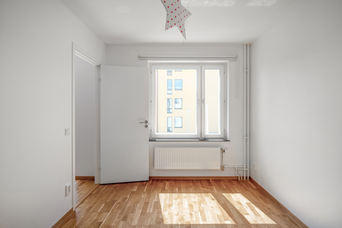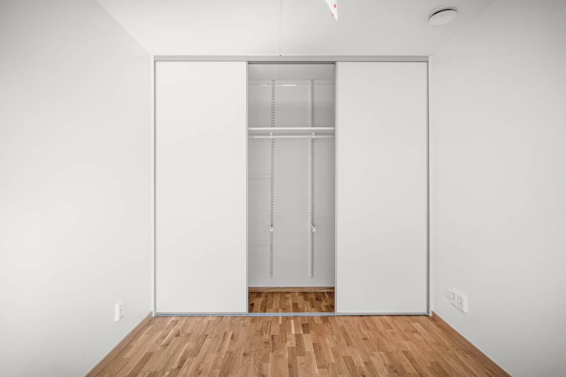 Rymligt sovrum med plats för dubbelsäng. Ytskikten utgörs av parkett på golv samt vacker tapet på väggar som tillsammans med rikligt ljusinsläpp från stort fönster skapar ett ljust och luftigt intryck. I sovrummet finns det även inbyggda skjutdörrs garderober.
