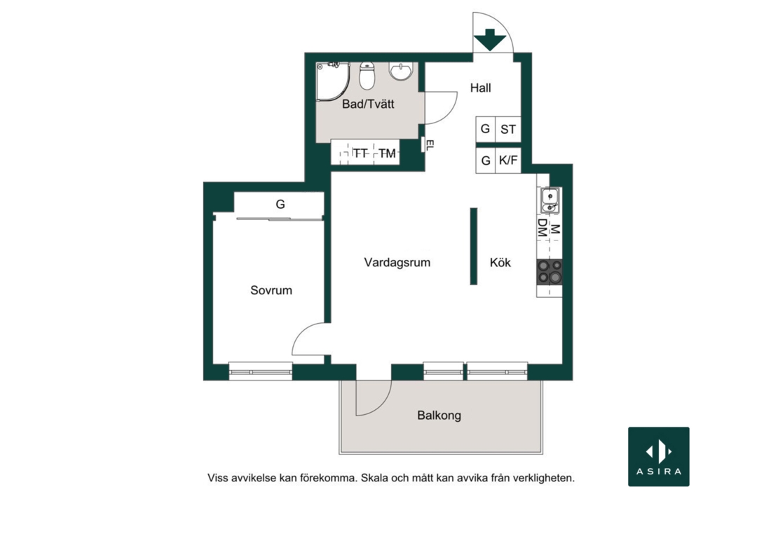 Välkomnande entré in till hall med goda avhängningsmöjligheter. Här finner ni även en inbyggd garderob med goda förvaringsmöjligheter, ytskikten utgörs av ljusa väggar, klinkers på golv vid entrén samt parkett på golv.