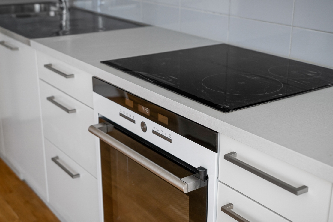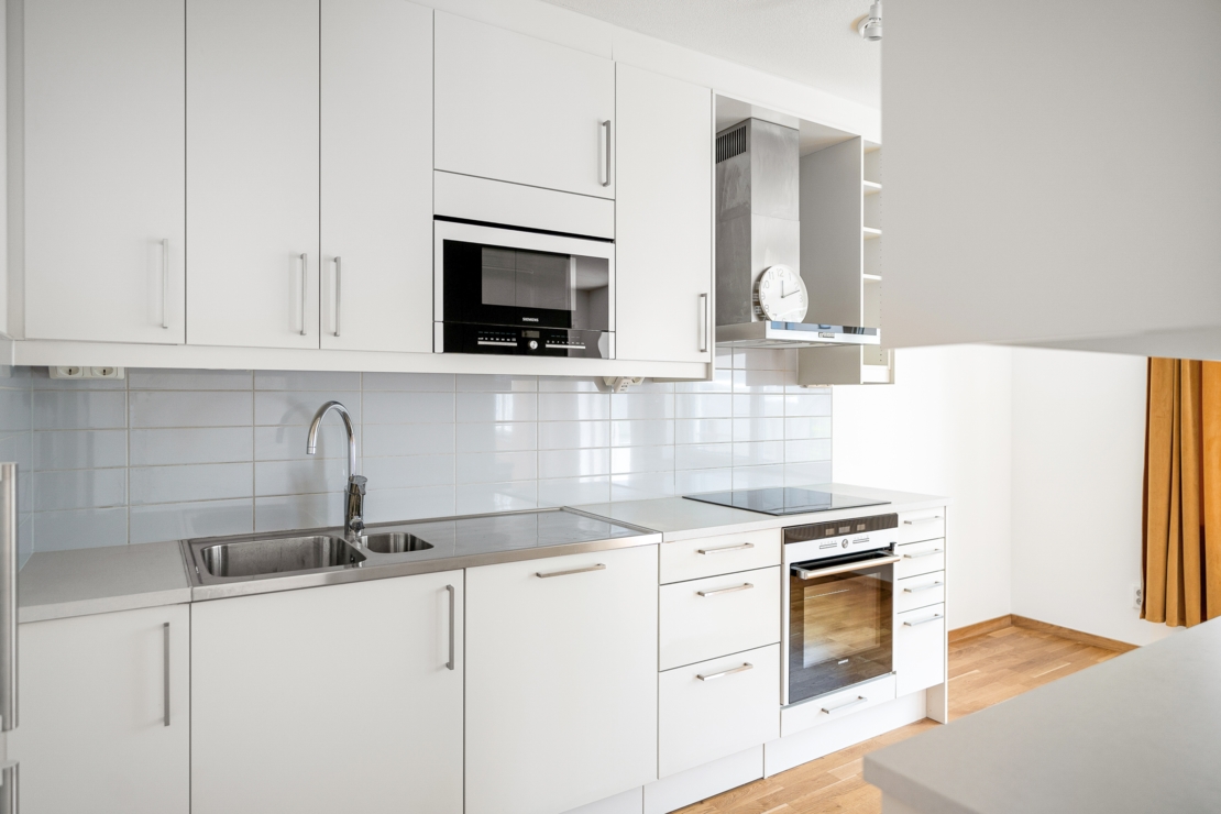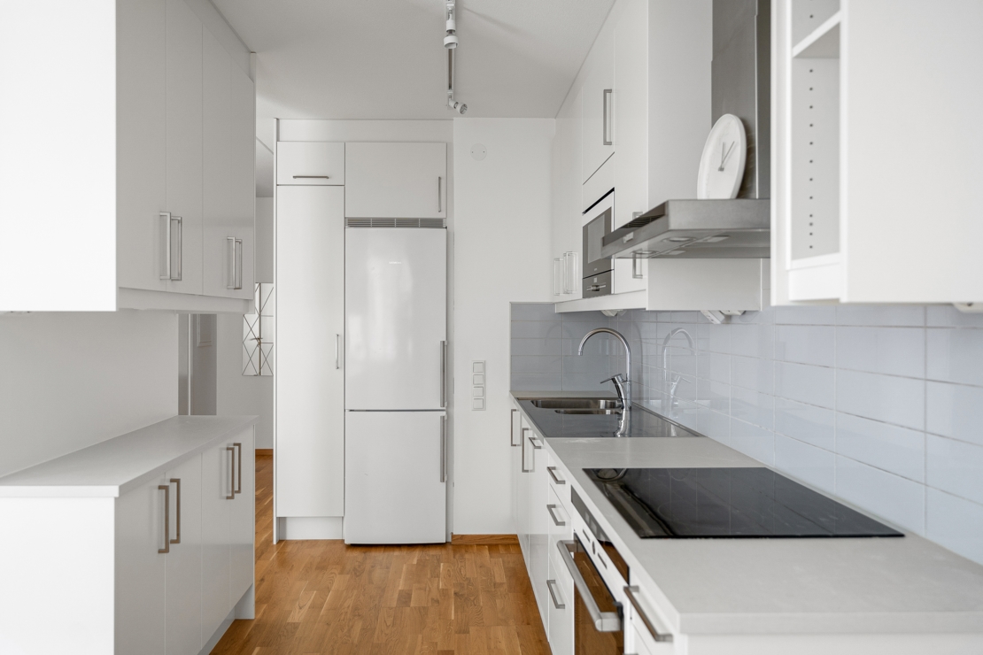 Stilrent kök med generösa ytor och bra materialval. Skåpsluckor i vitt med stilrena handtag och vita luckor. Vitvaror bestående av kombinerad kyl/frys, ugn, mikrovågsugn, induktionshäll, köksfläkt och diskmaskin. Intill fönstret finns naturlig matplats för stora sällskap. Rikligt ljusinsläpp från stort fönster och utgång till balkong.