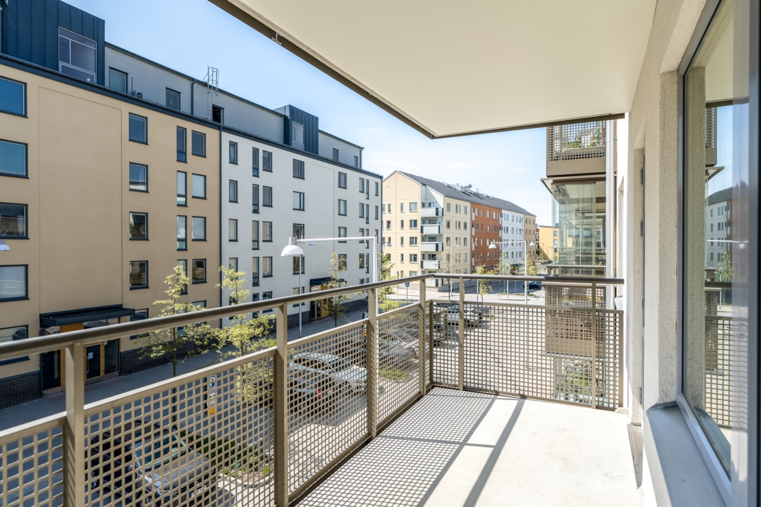 Möblerbar och inglasad balkong i söderläge med många soltimmar med utsikt över Järvastadens hjärta spegeldammsparken. Här finns utrymme nog för sittplatser åt 2-6 personer.